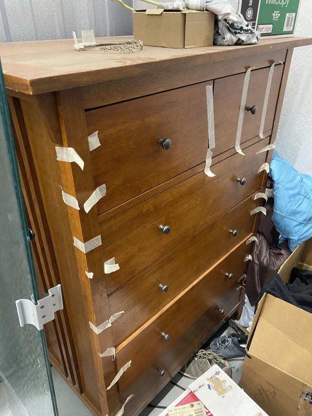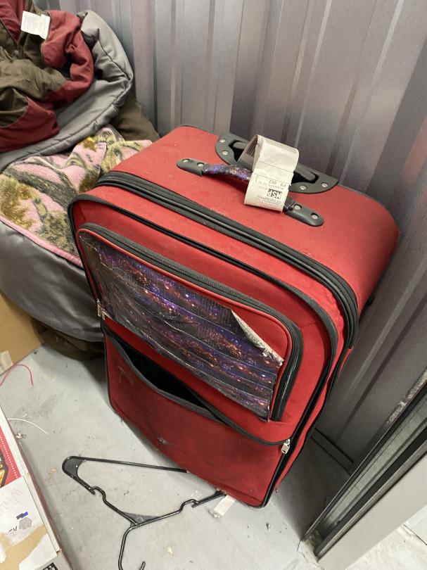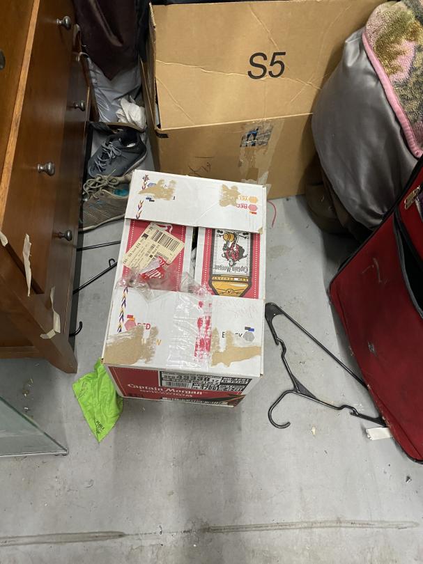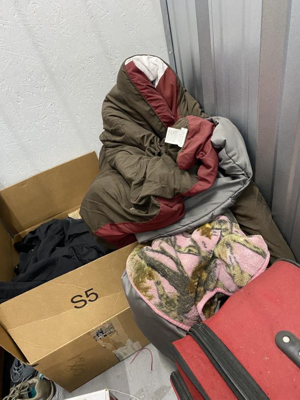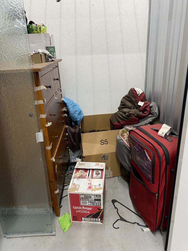This unit appears to contain…Drive-Through Heated Dresser, boxes, suit case, blankets and jewelry