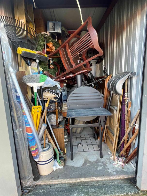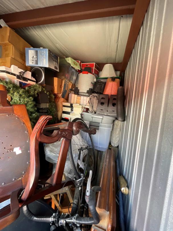 This unit appears to contain…furniture, lawn equipment, grill, umbrella, decorations, stereo, suitcase, tools, totes, boxes, bike
