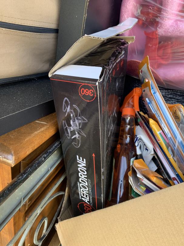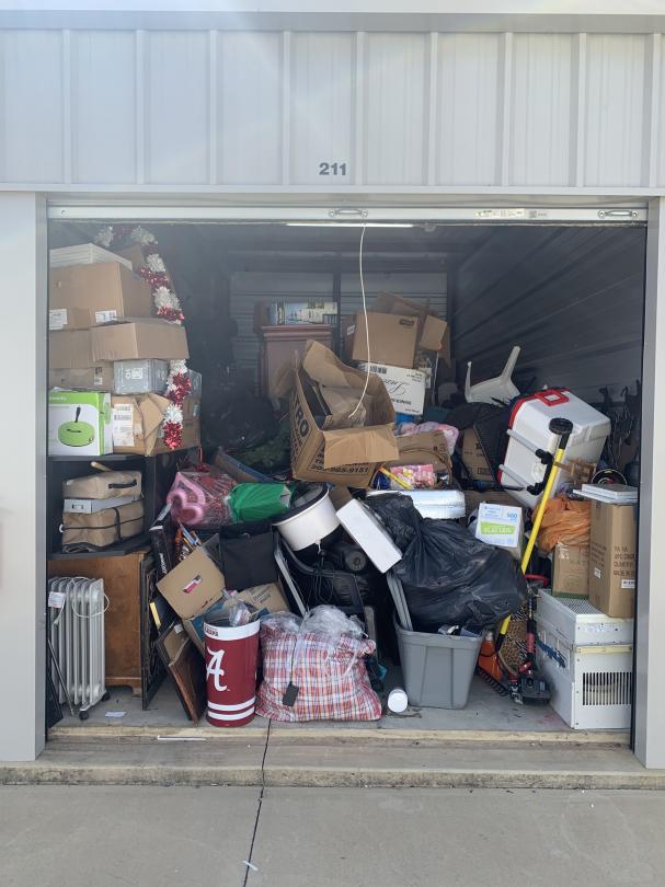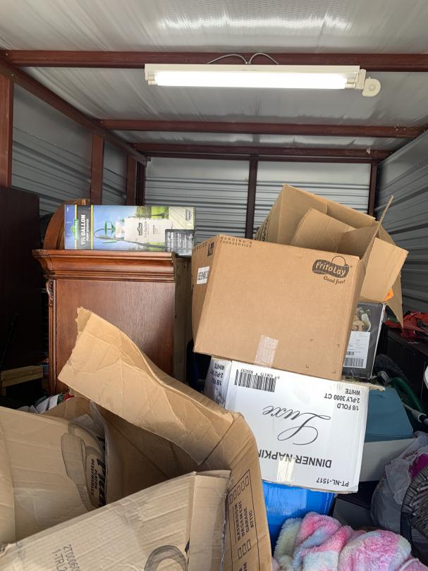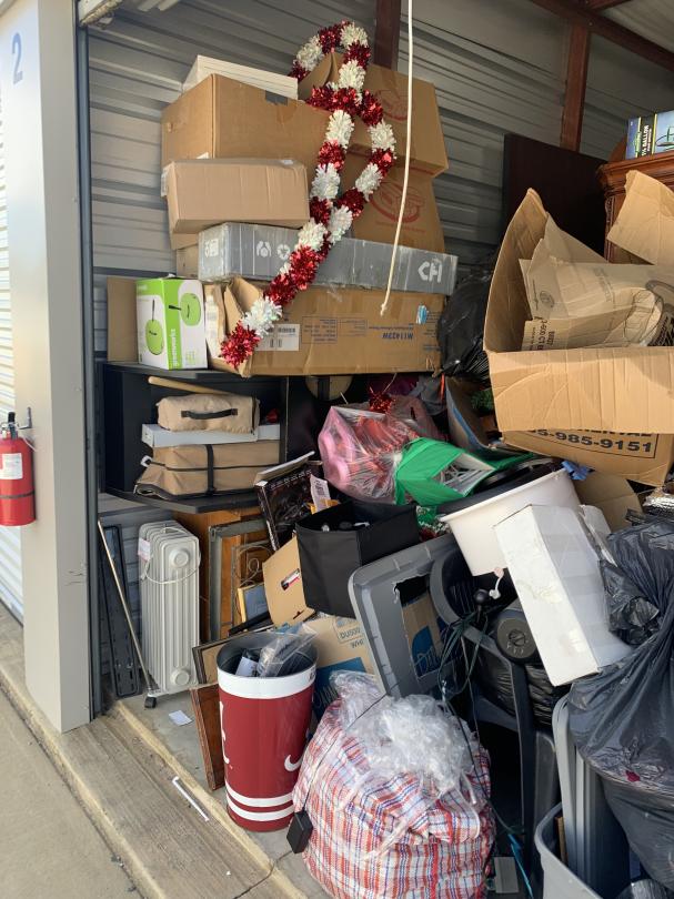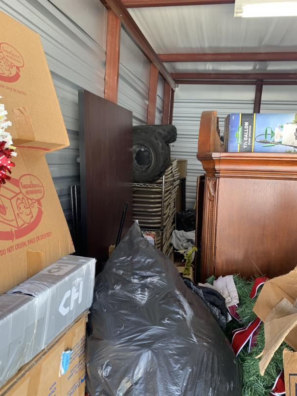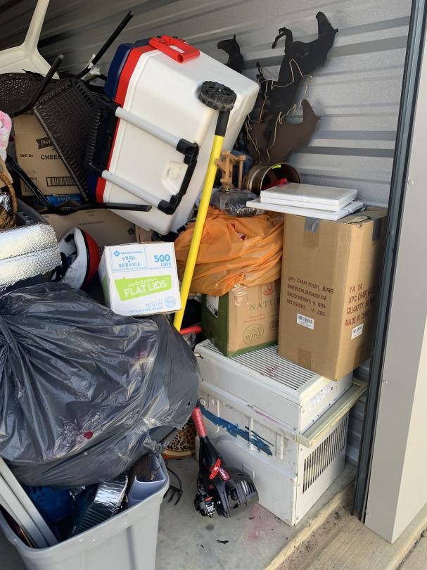 This unit appears to contain…Window AC Unit, Radiator Heater, Cooler, Home Decor, Folding Chairs, Folding Table, Weed Trimmer, RC Drone, Art Supplies, Boxes and Totes, Cleaning Supplies, Dresser, School Supplies