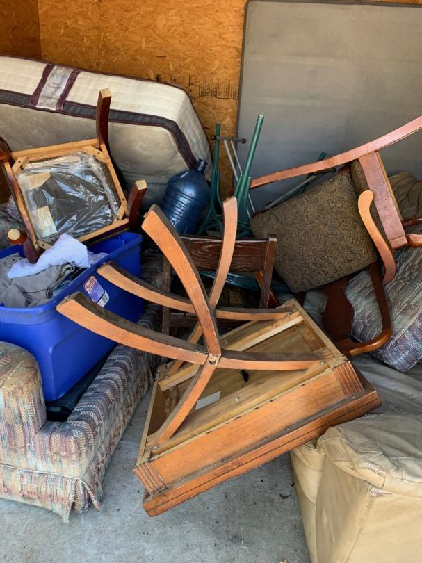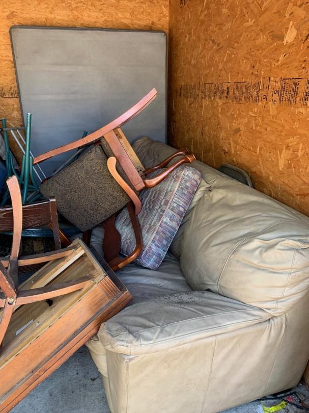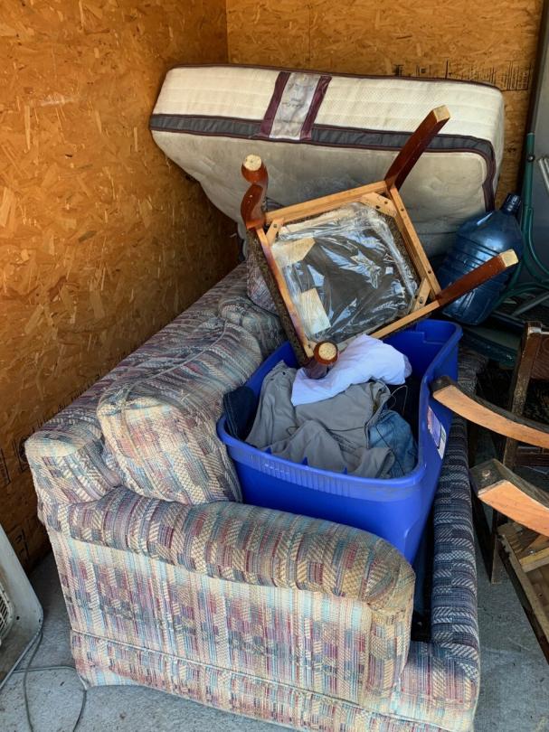 This unit appears to contain…couches, end tables, mattress, plastic containers, misc. items