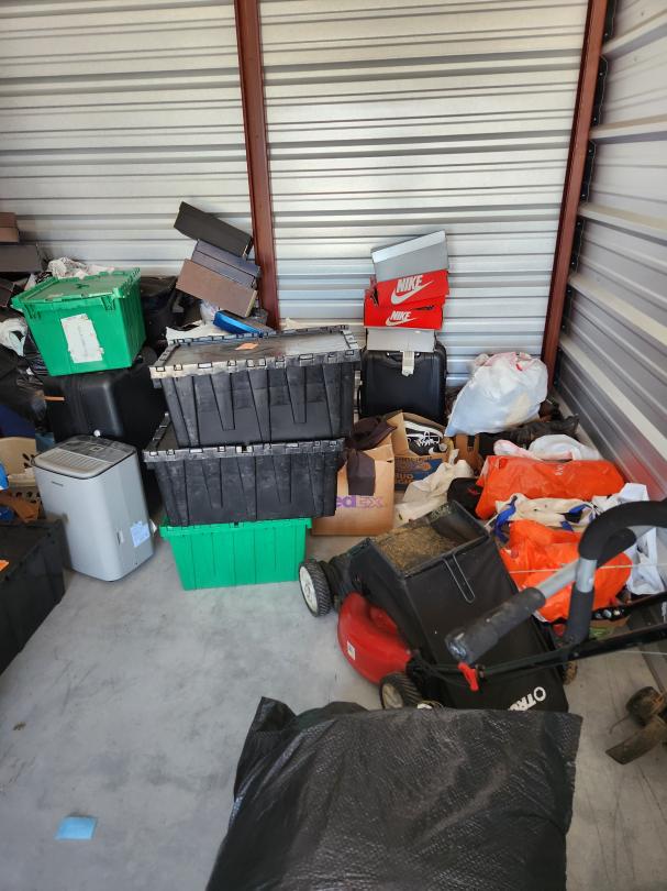 This unit appears to contain…CONTAINERS, BAGS, LAWN MOWERS, WEED EATER, TOTES, TENNIS SHOES