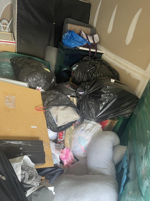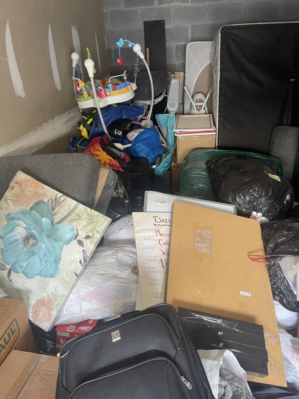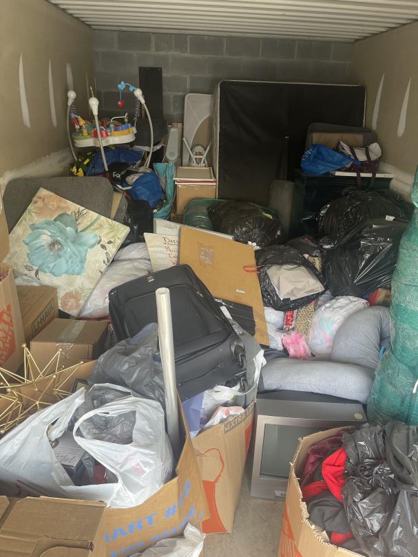 This unit appears to contain…furniture, boxes, TV, couch, mattresses, bags, toys and misc. items