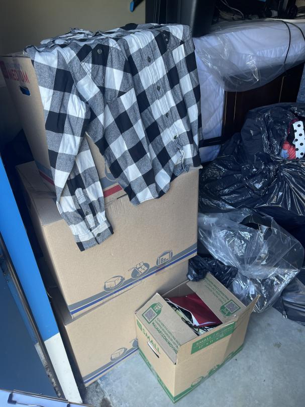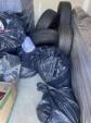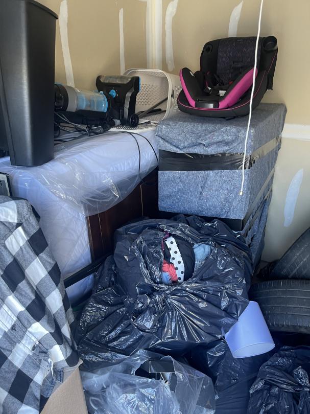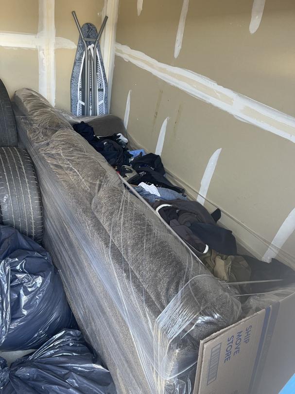 This unit appears to contain…tires, bags, boxes, couch, clothes, vacuum, baby seat and misc items