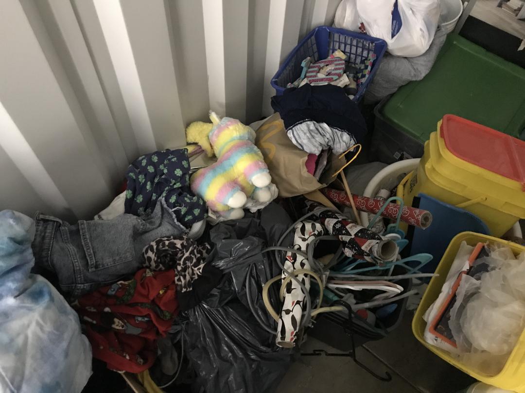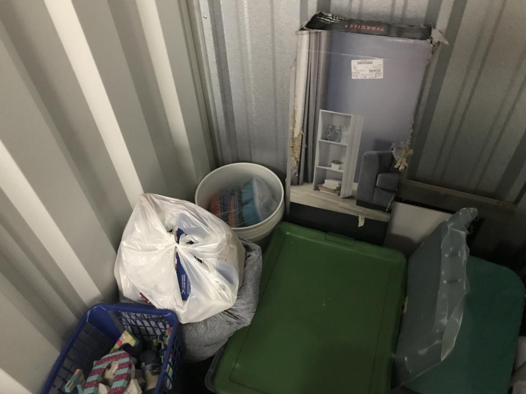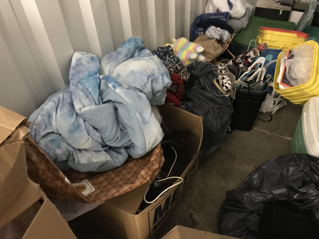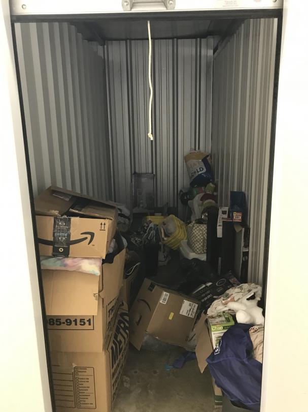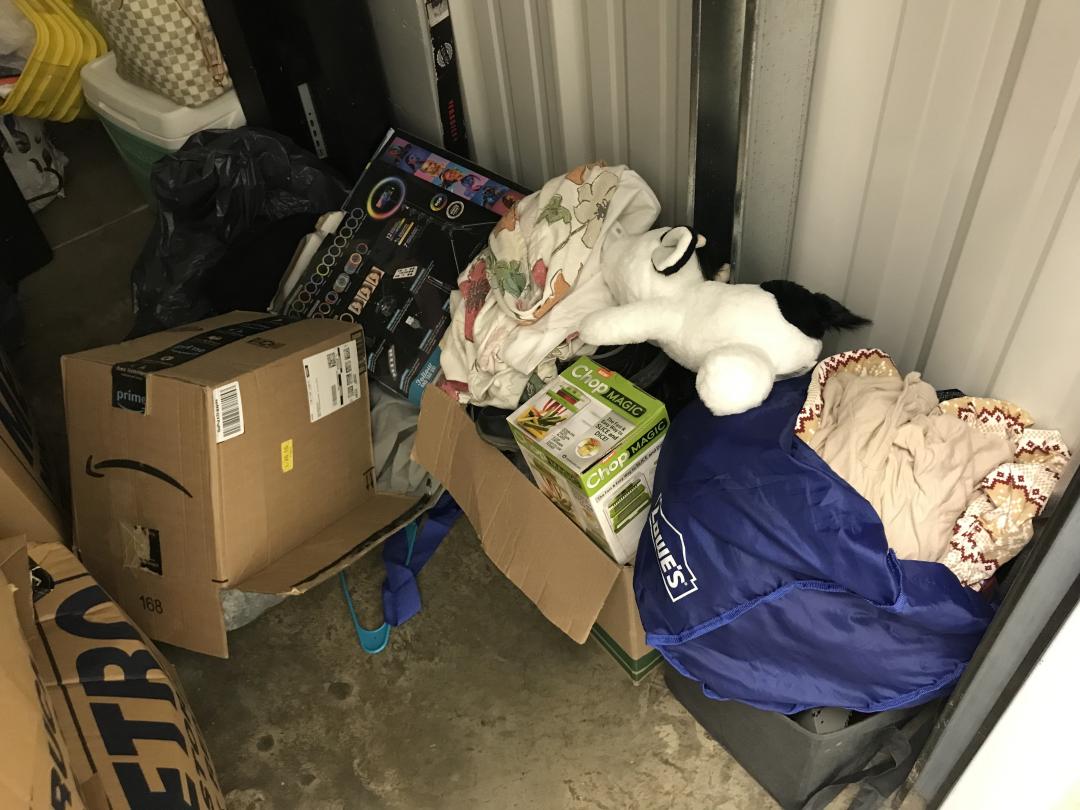 This unit appears to contain…boxes, clothes, stuffed animals, cooler, grill, TV, TV speakers, totes, tubs, bags