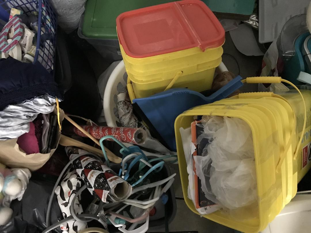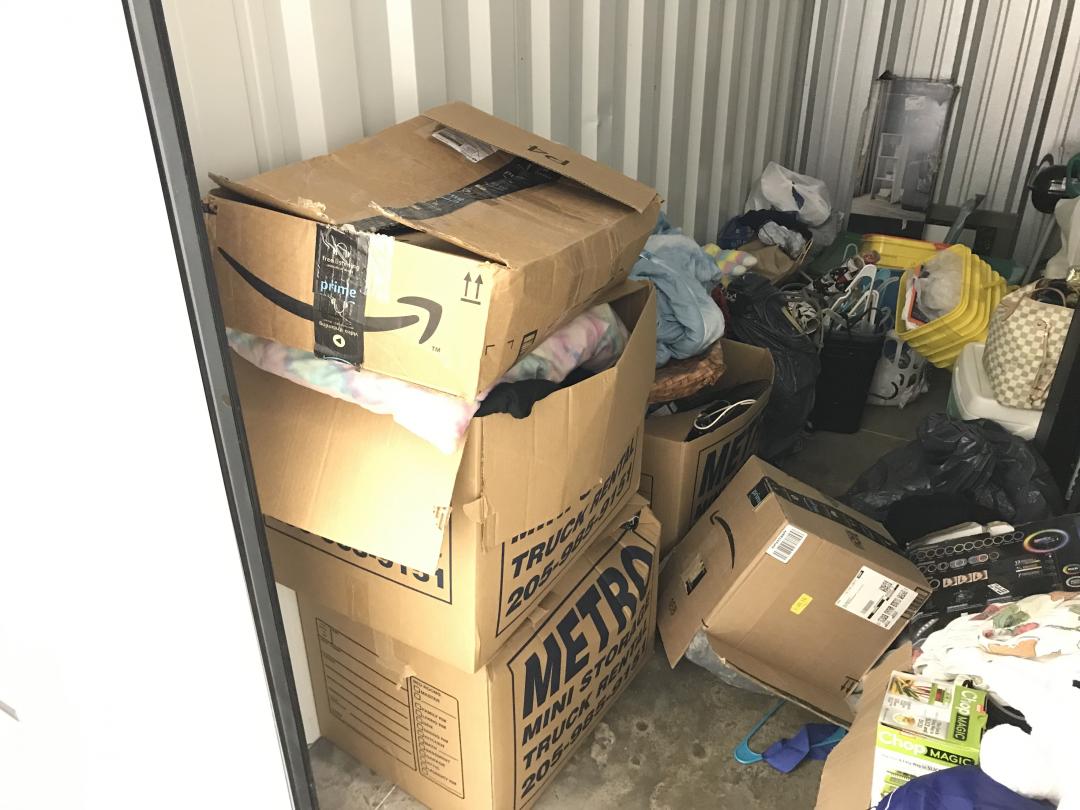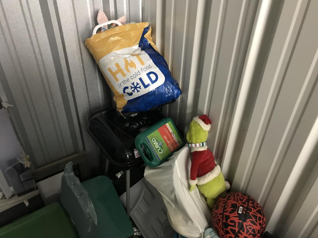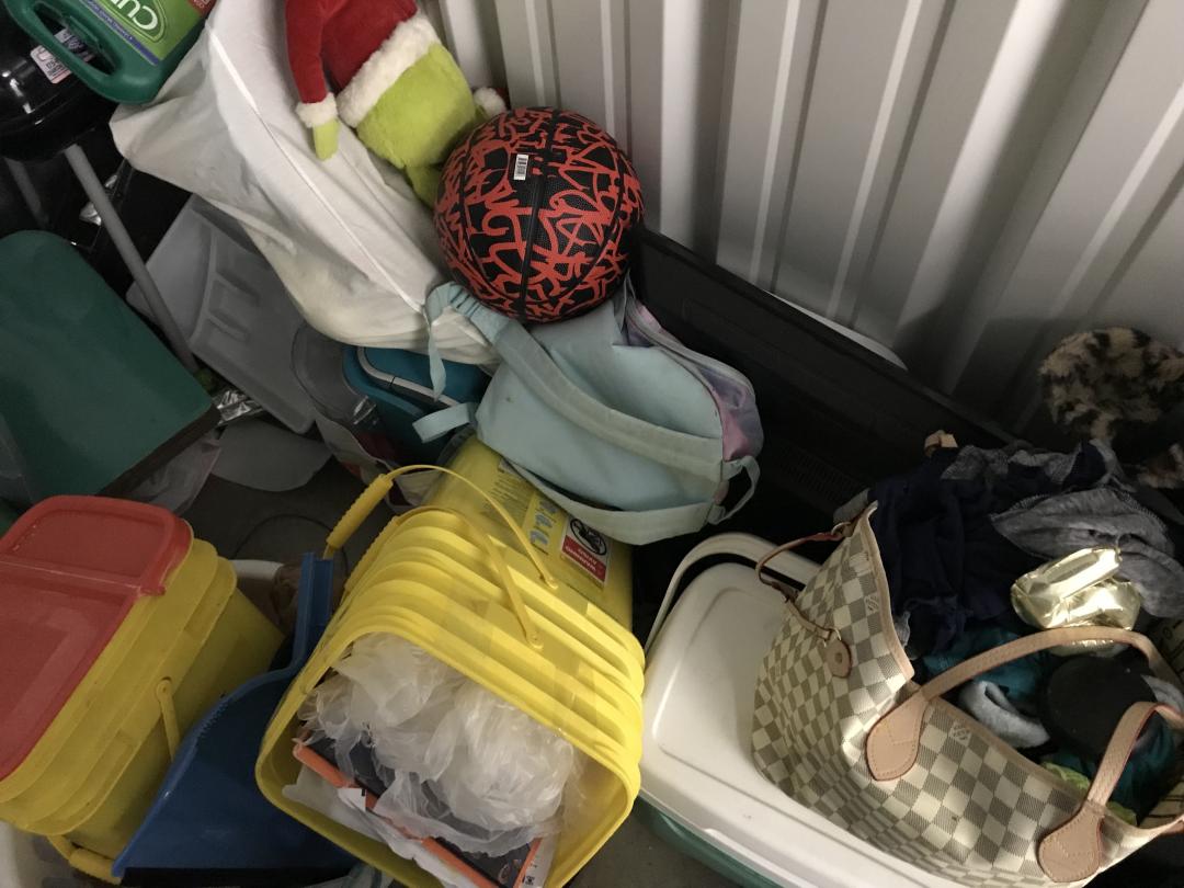 This unit appears to contain…boxes, clothes, stuffed animals, cooler, grill, TV, TV speakers, totes, tubs, bags