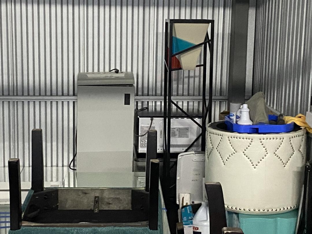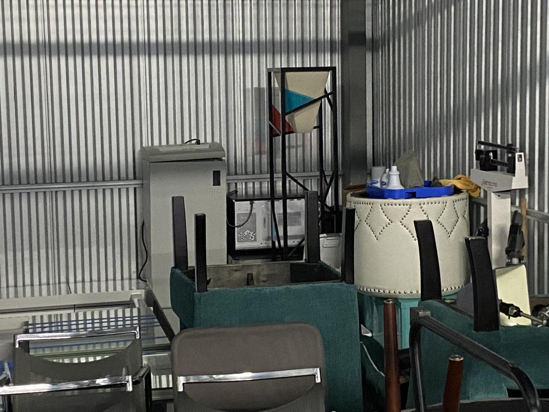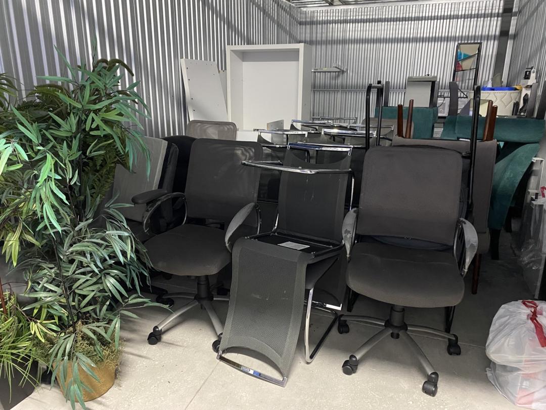 This unit appears to contain…Desks, chairs, microwave, bags, lamps, fake plants