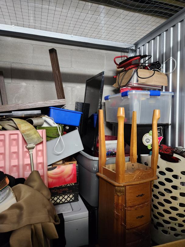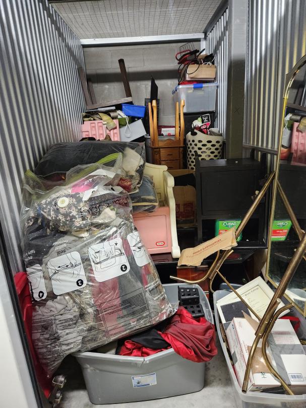 This unit appears to contain…BAGS/BOXES/SHOES/SHOPLIGHT/MIRROR/DRESSER/FOODSAVER/NIGHTSTAND/TOYS/TV