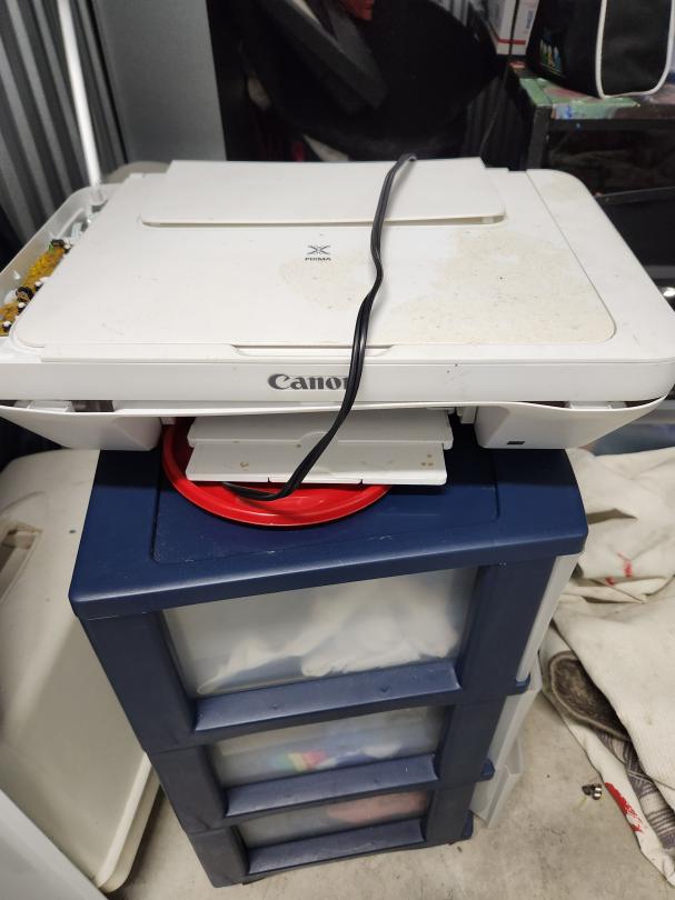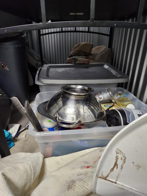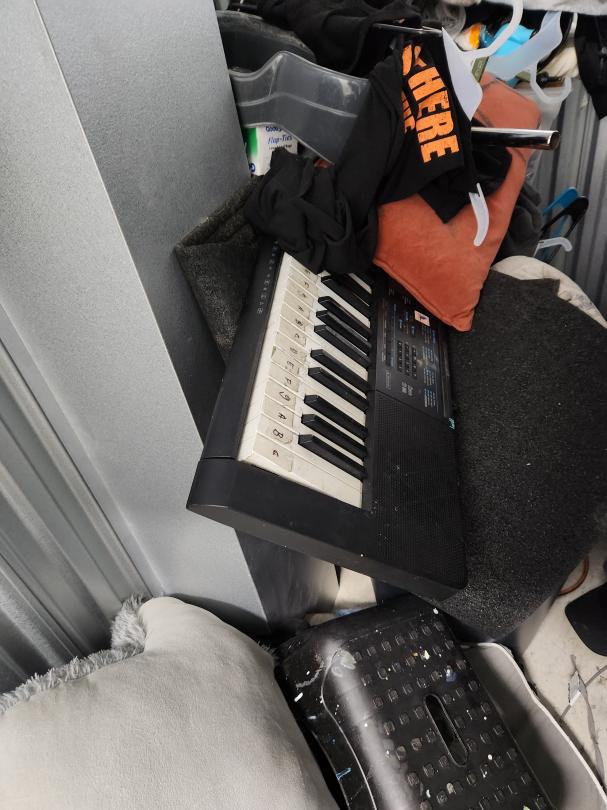 This unit appears to contain…BAGS/BINS/CANON PRINTER/POTS AND PANS/KEYBOARD/CLOTHES/TABLE/CHAIR/FAN