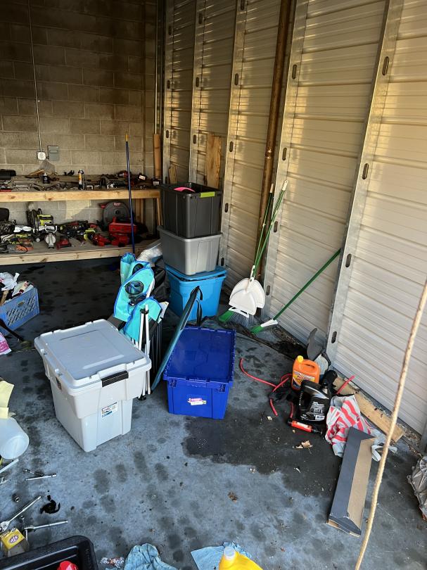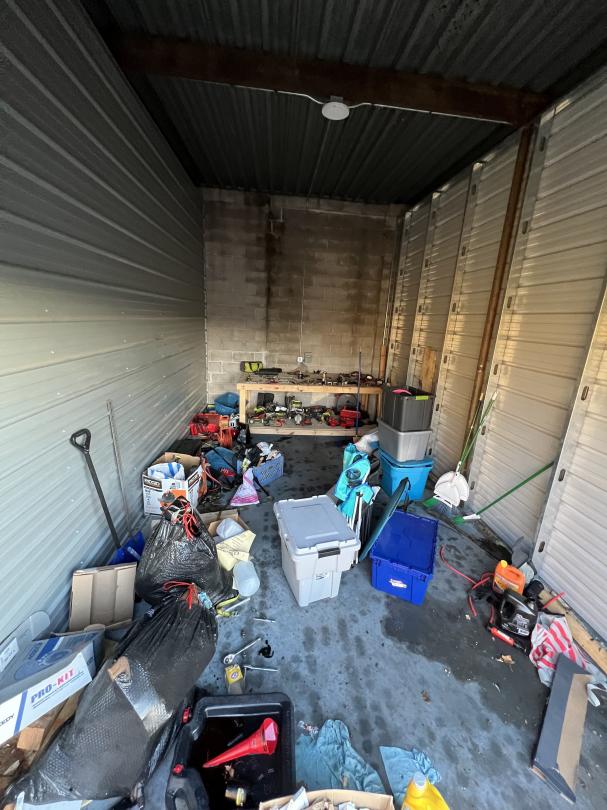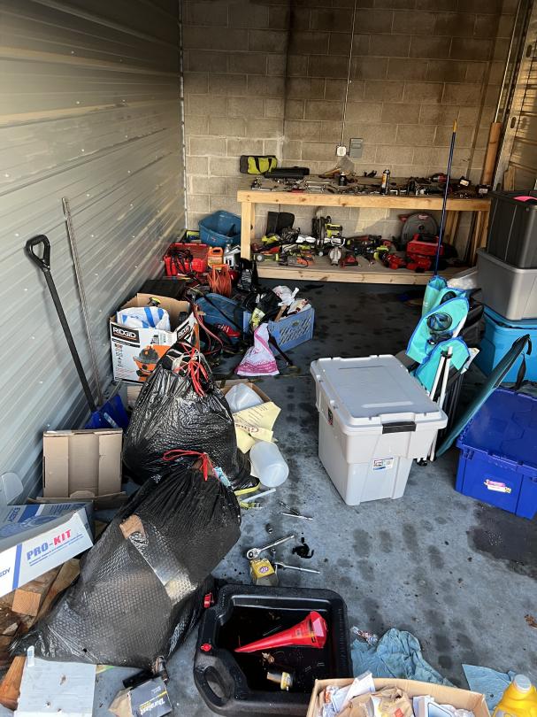 This unit appears to contain…Unit appears to contain, tools, hand tools, electric saw, electric hand tools, totes, shovel, extension cord, automotive tools, work bench
