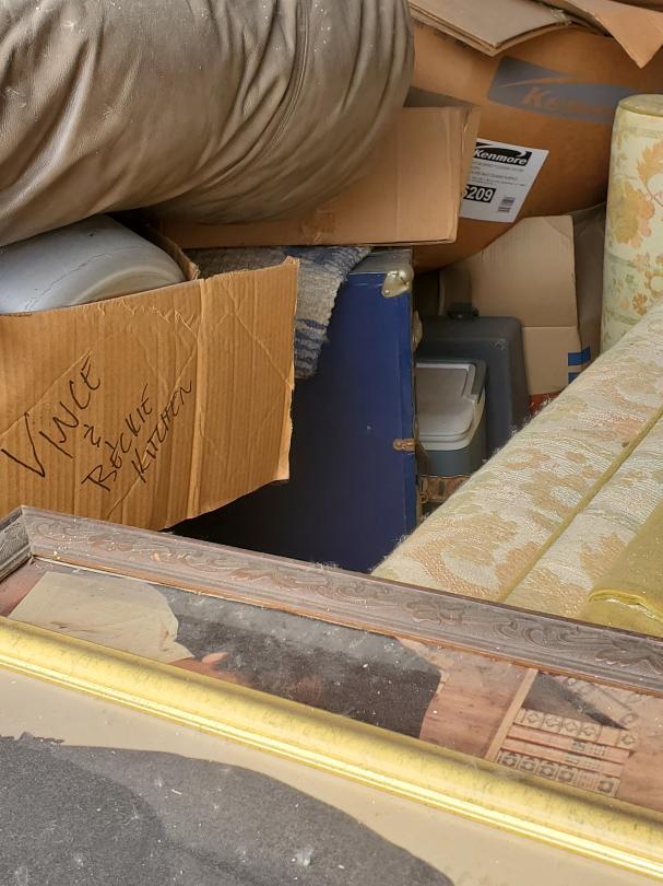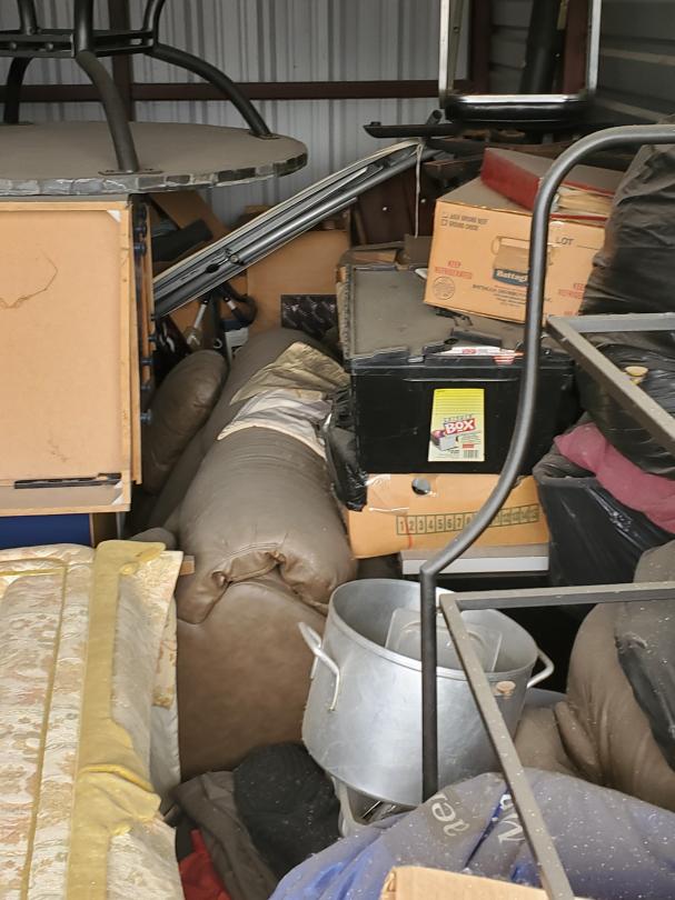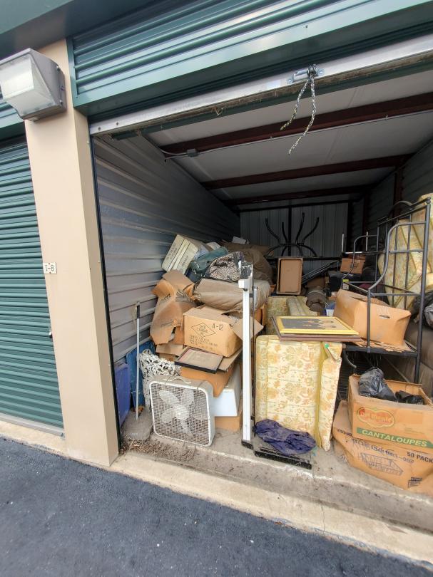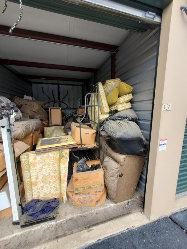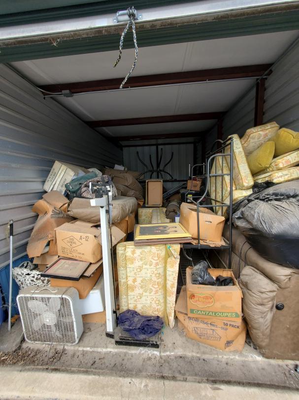 This unit appears to contain…Unit appears to contain, couch, wire rake, boxes, fan, doctors scale, table, chairs,