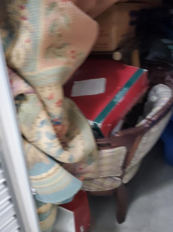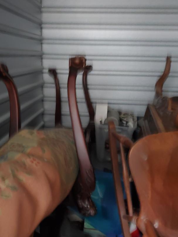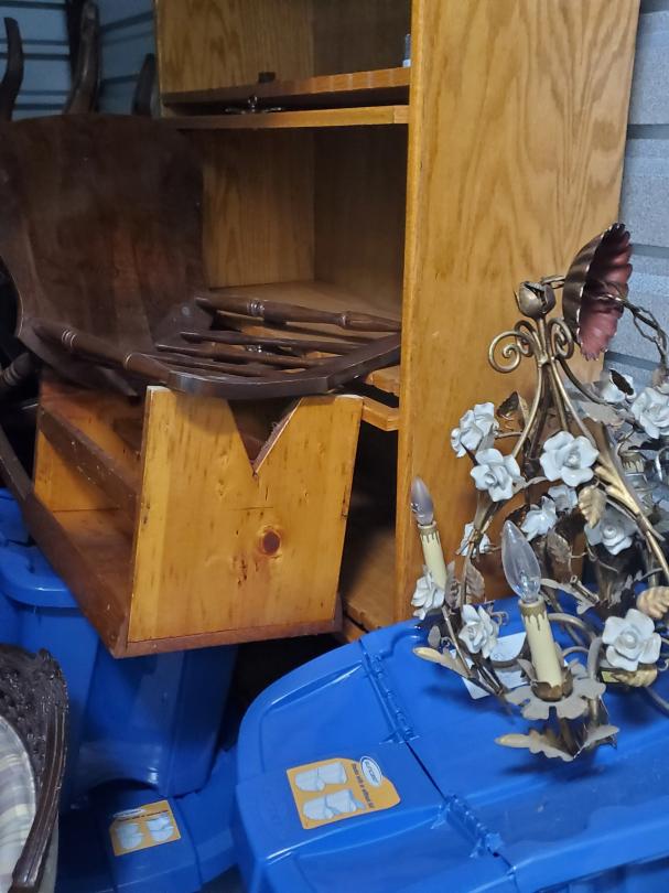 This unit appears to contain…Unit appears to contain, totes, chairs, wood bookshelf.