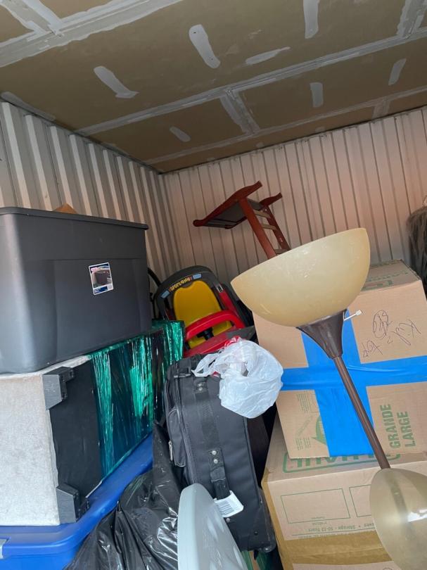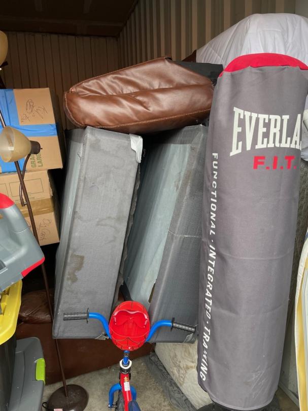 This unit appears to contain…Unit appears to contain, boxes, totes, dresser, booster seat, luggage, bed, punching bag, iron board, bike, power wheel, toddler bed.