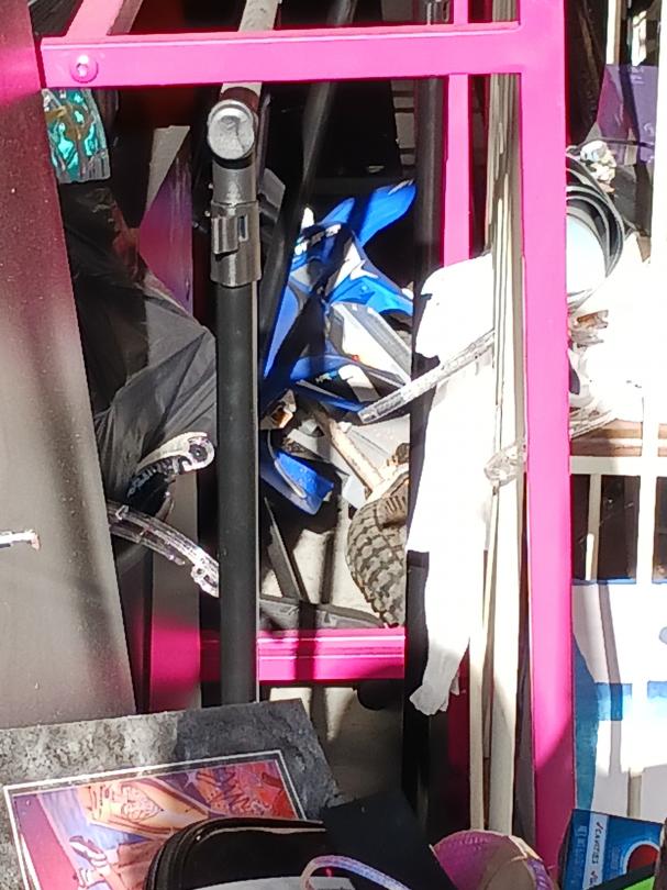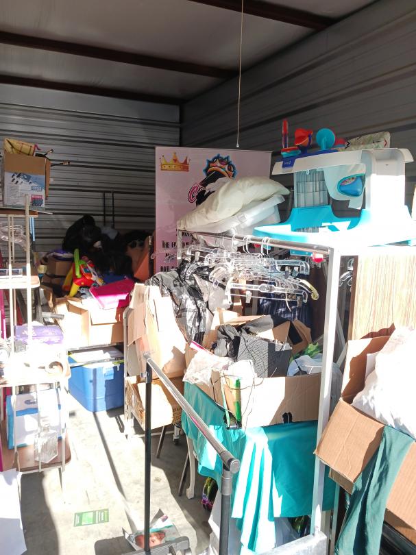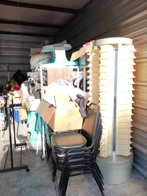 This unit appears to contain…CHAIRS, COFFEE TABLE, RACKS, BOXES, KIDS MOTORCYCLE, MANNEQUINS