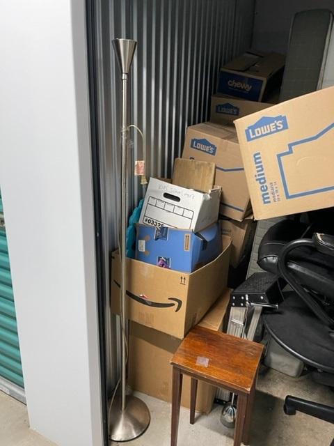 This unit appears to contain…Boxes, Step Ladder, Computer Chairs, Lamp, Table,