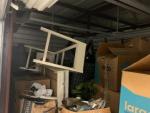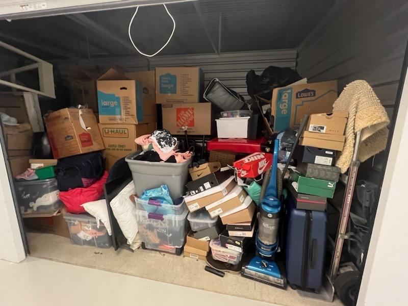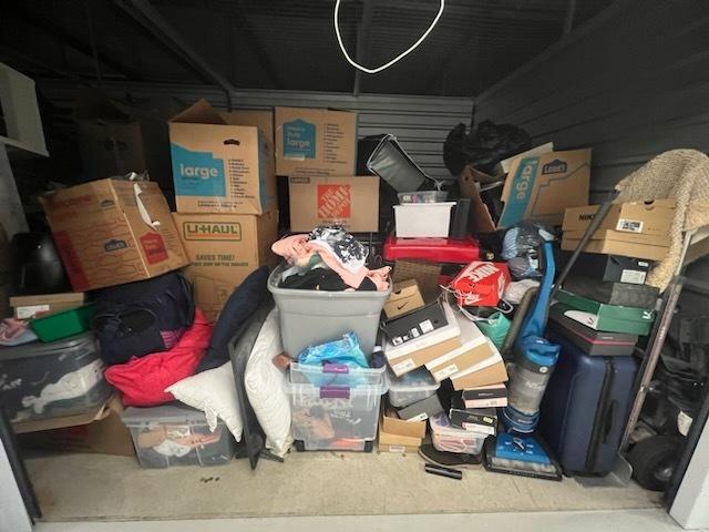 This unit appears to contain…Dryer,TV,Bed Frame,Chairs,Plastic Containers,Misc. Boxes,Clothing,Misc. Items,Suitcases,Chests