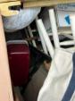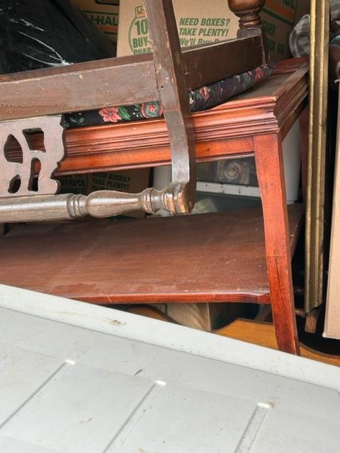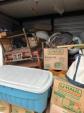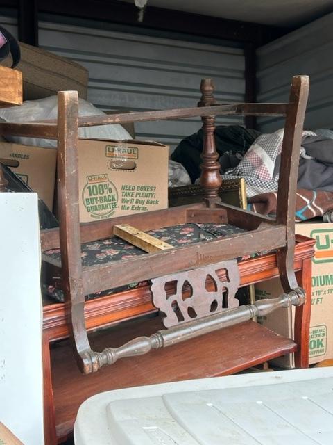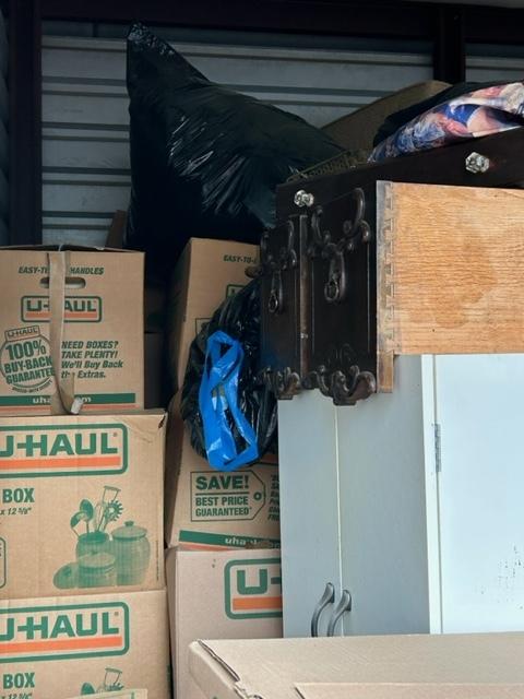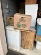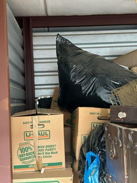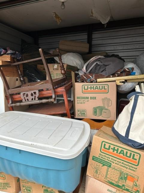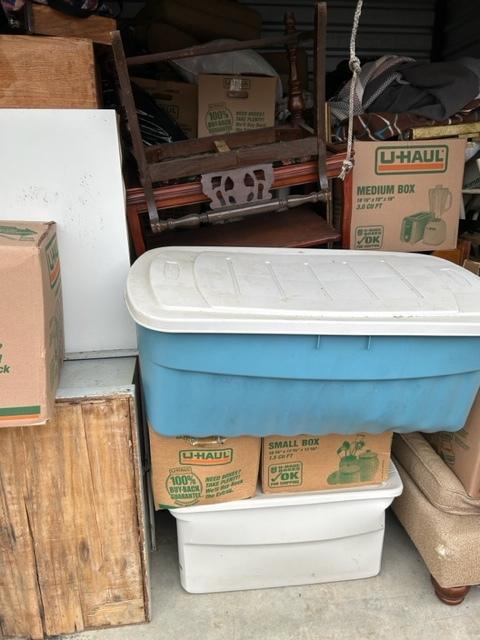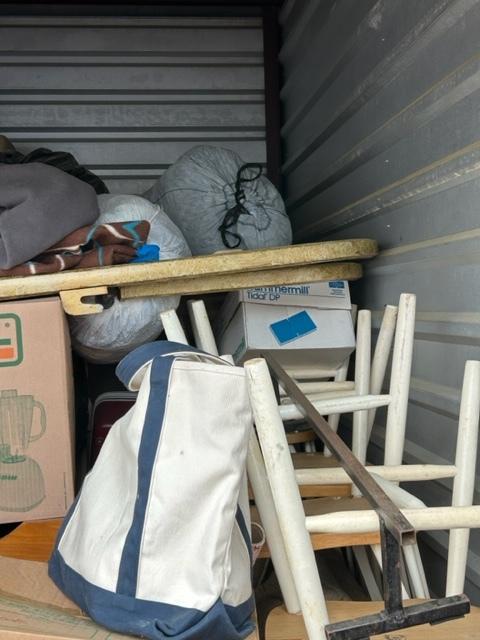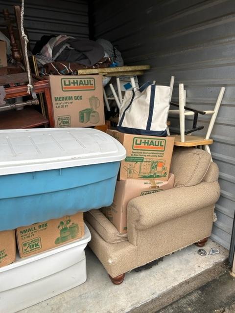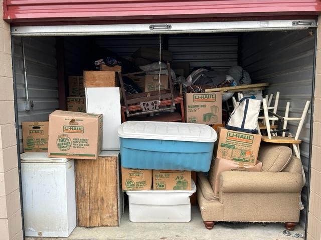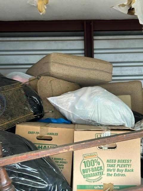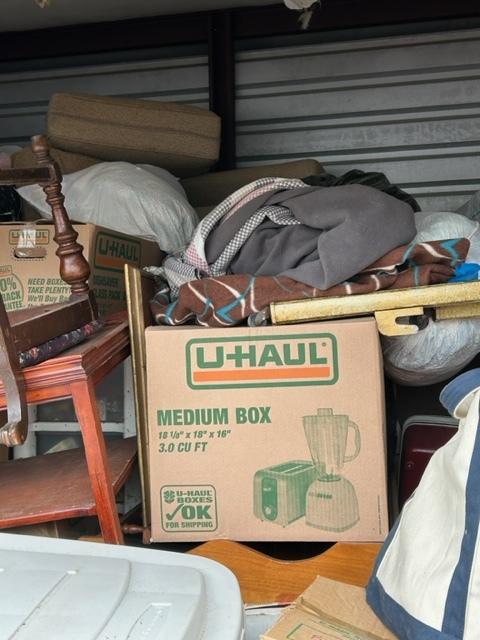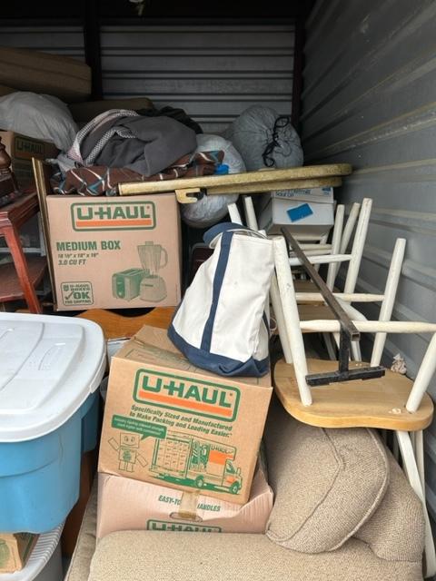 This unit appears to contain…This unit contains: deep freezer, boxes, lamp, totes, couch, bar stools, tables, bags, mattress, wrapping paper, bed frame, chairs, and a cabinet.