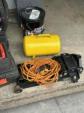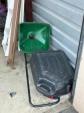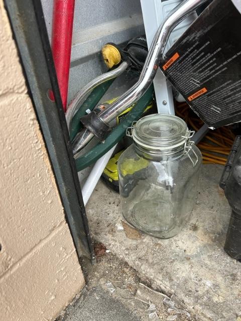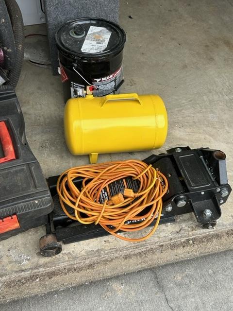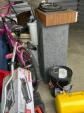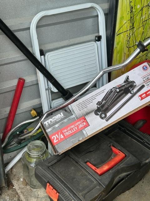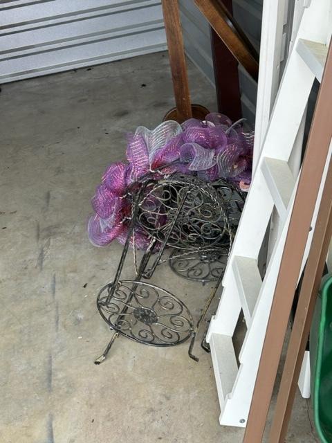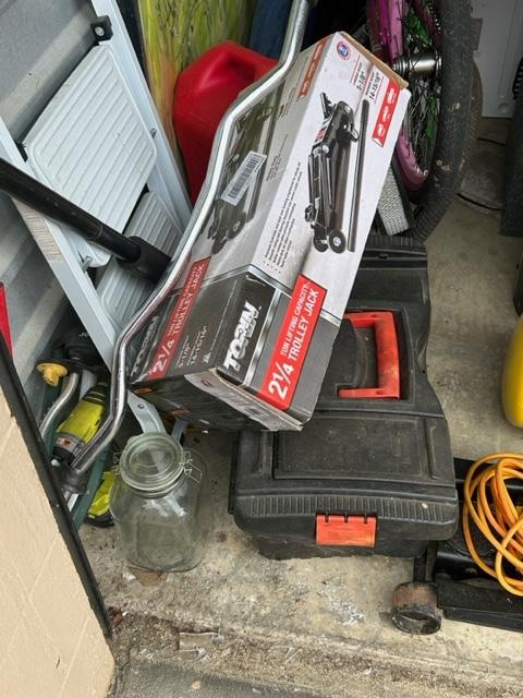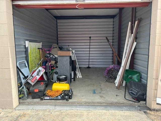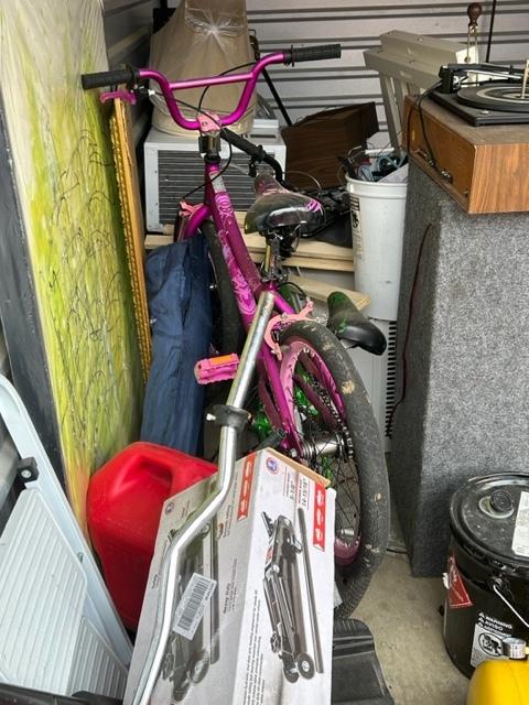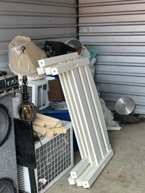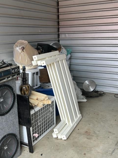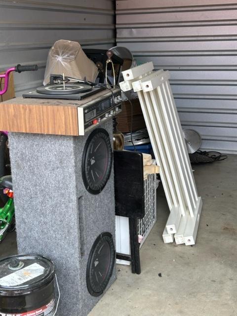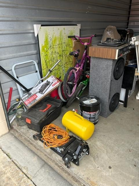 This unit appears to contain…This unit contains: Bunk bed frame, floor mirror, seed spreader, floor lamp, lamps, lamp shades, speaker, air tank, jack, extension cords, step ladder, tool box, canvas pictures, gas jug, kids bicycles, air conditioners, fryer/cooker, totes, bags, metal stand, hub caps, lawn chair in a bag, record player, yard/grass sprinkler, and a power drill.