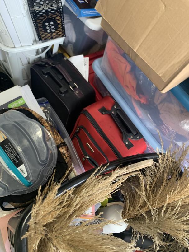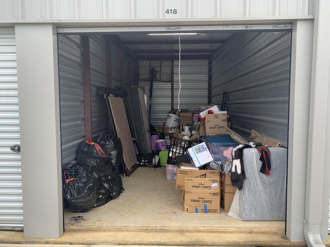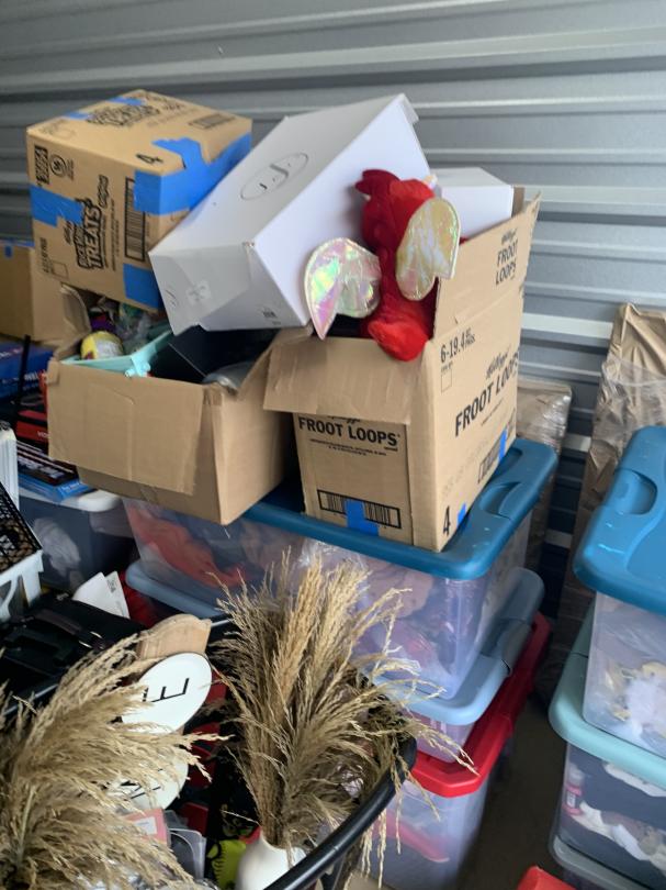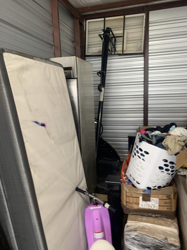 This unit appears to contain…Mattress, Box Springs, Razor Moped, Clothes, Shoes, Karaoke Machine, Totes, Boxes, Suitcases, Christmas Decor, Instant Pot, Basketball Goal