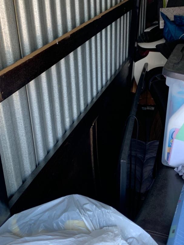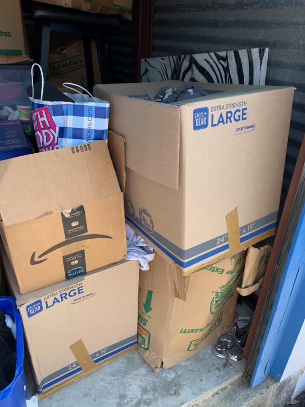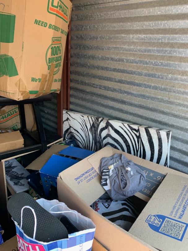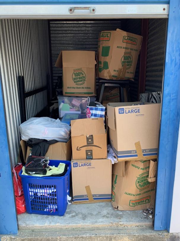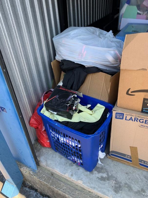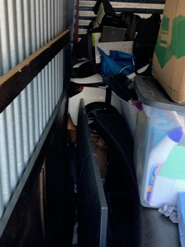 This unit appears to contain…TV, bed frame, chairs, plastic bags, plastic containers, misc. boxes, clothing, misc. items, laundry baskets, artwork