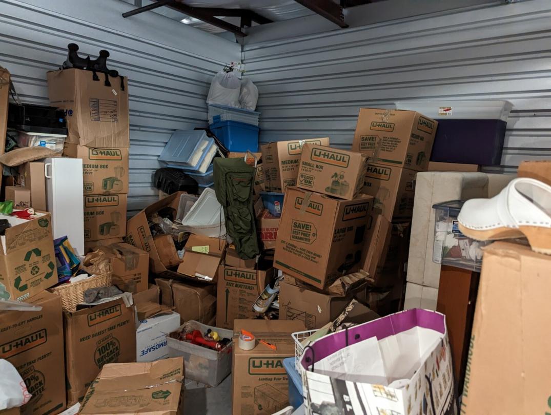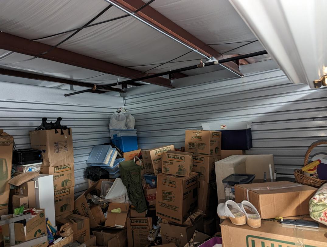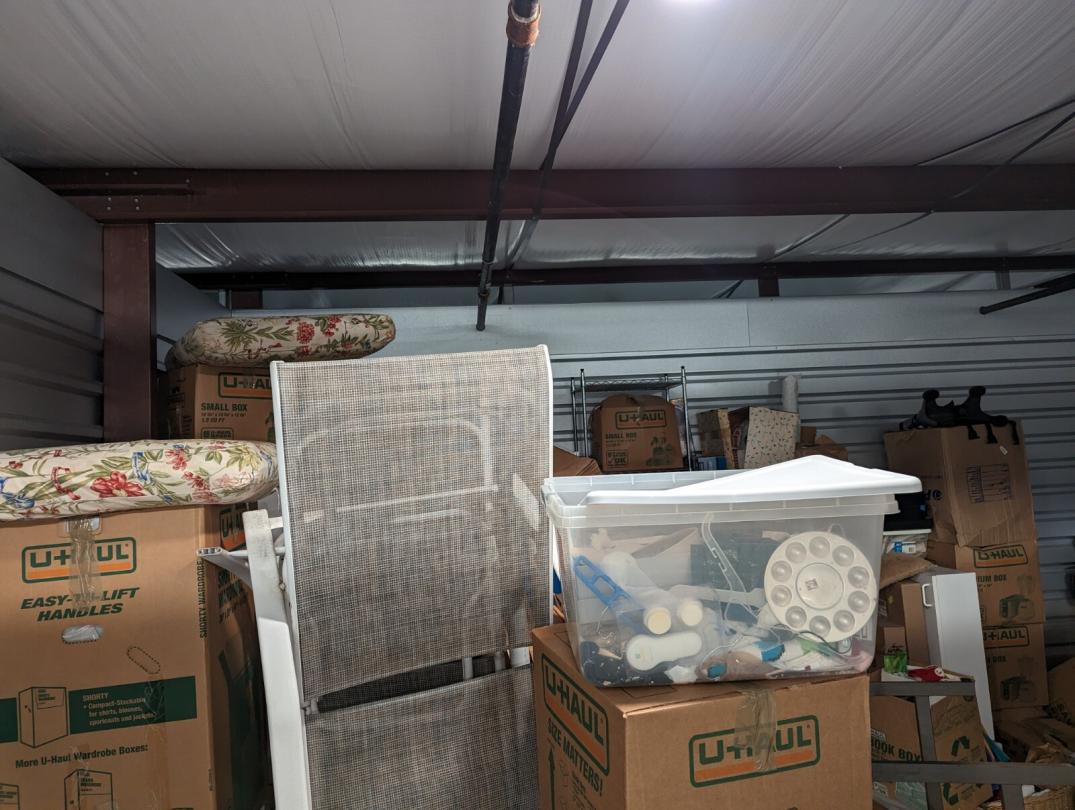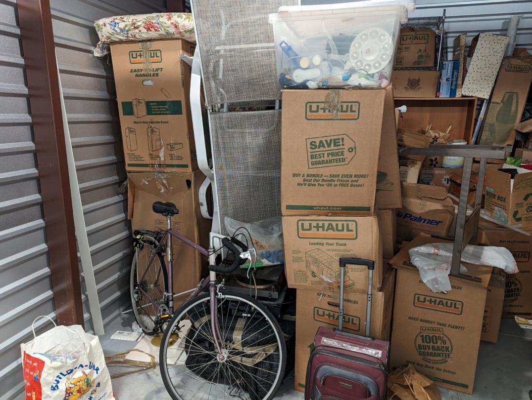 This unit appears to contain…Appears to have a man's bike, boxes, containers, bags, shoes, ironing board, sectional couch, luggage, table chairs, outdoor chairs, cushions, Cabinet, stainless steel rack, Coolers, Campers Back Pack, Baskets, Batting,
