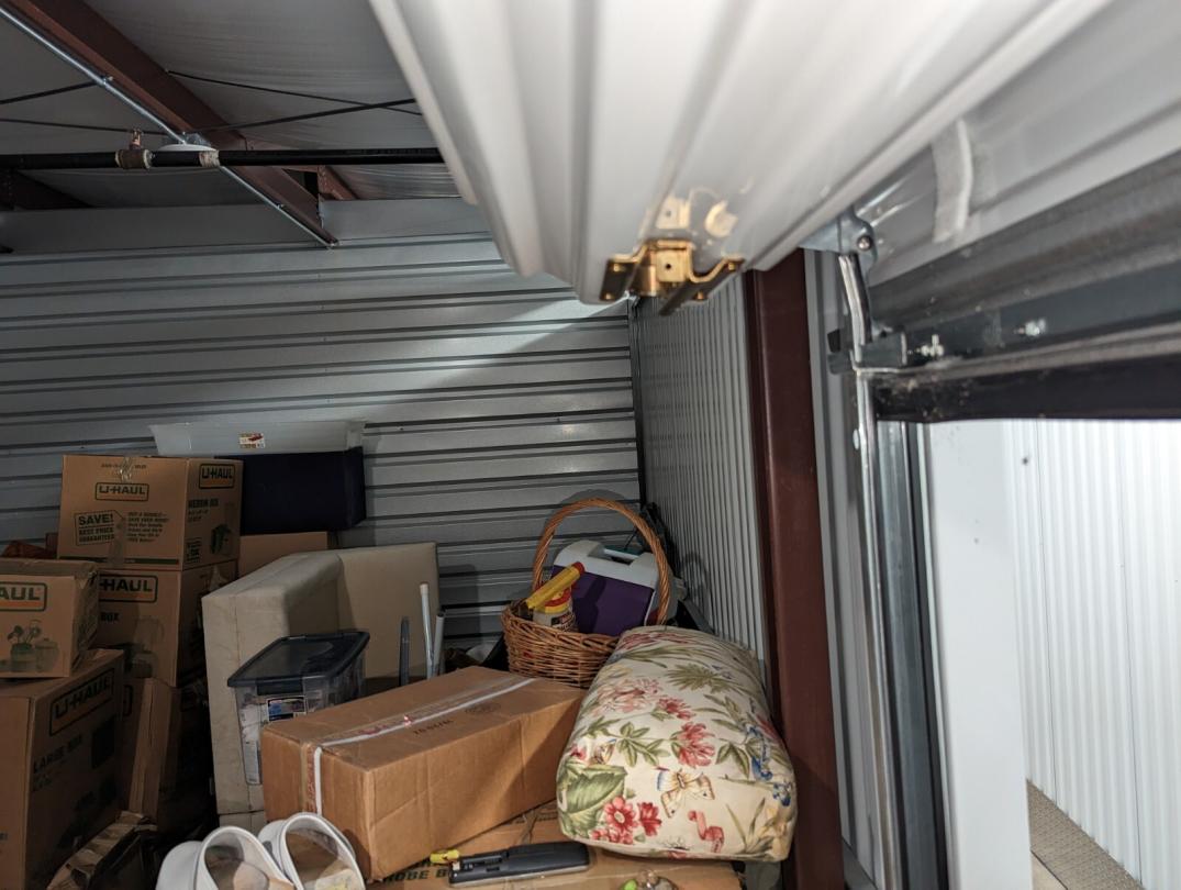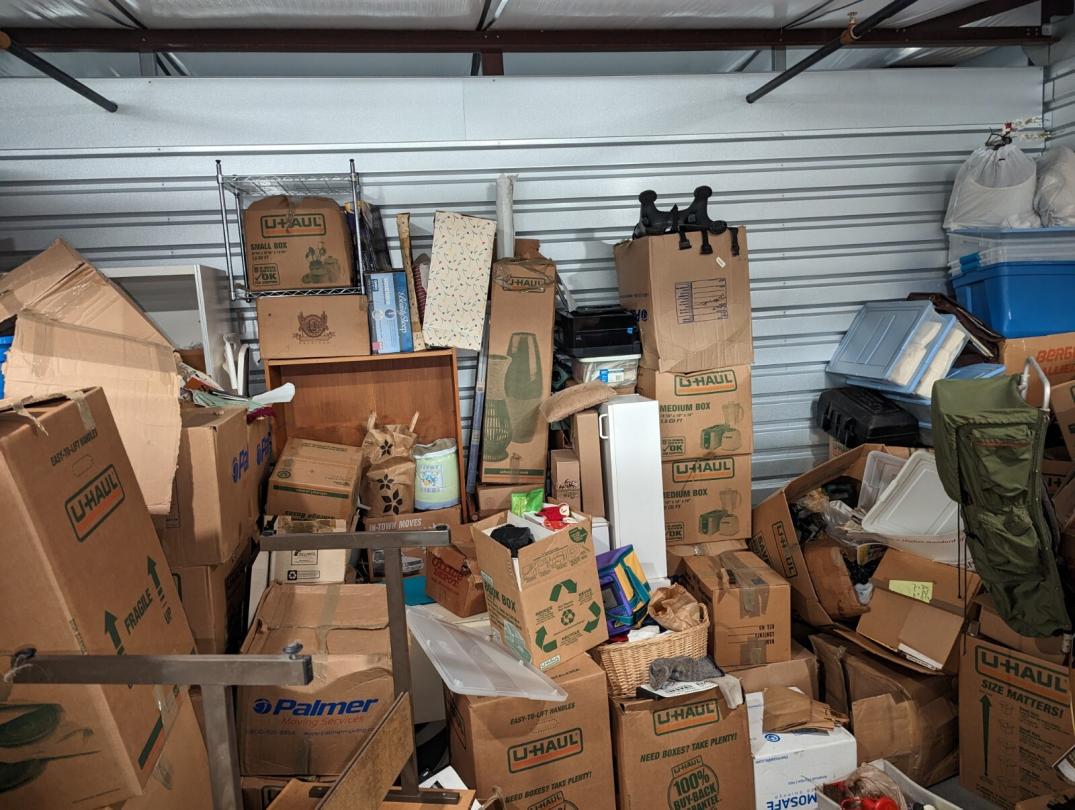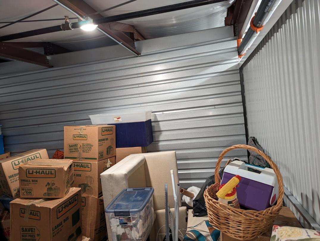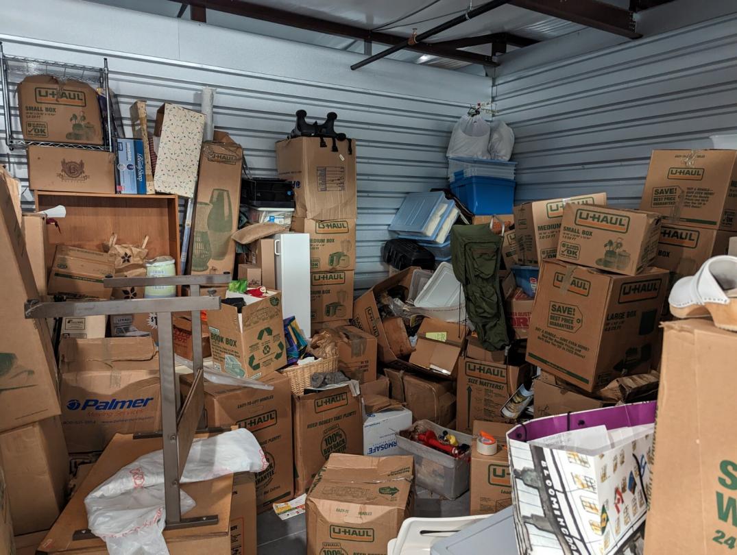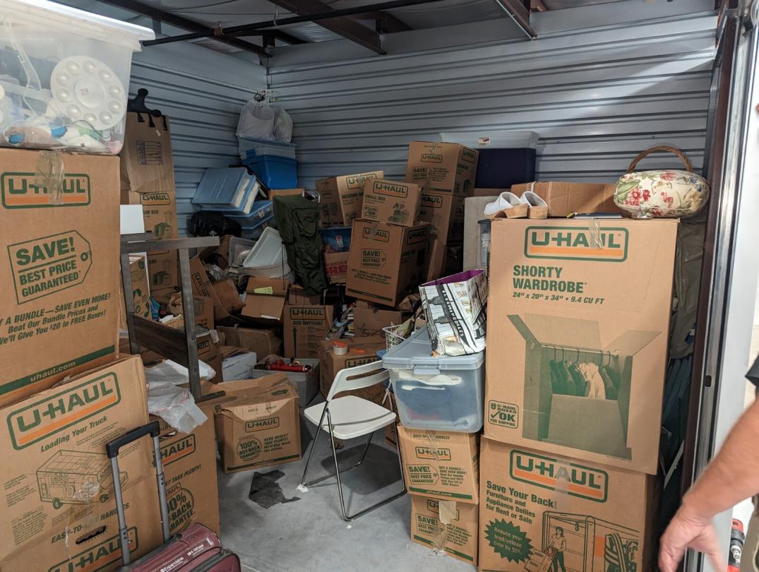This unit appears to contain…Appears to have a man's bike, boxes, containers, bags, shoes, ironing board, sectional couch, luggage, table chairs, outdoor chairs, cushions, Cabinet, stainless steel rack, Coolers, Campers Back Pack, Baskets, Batting,