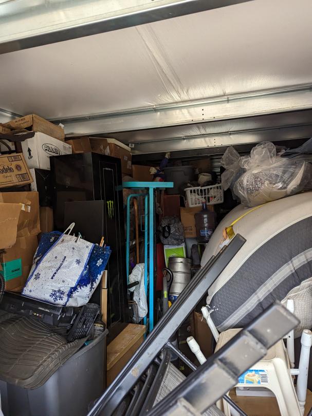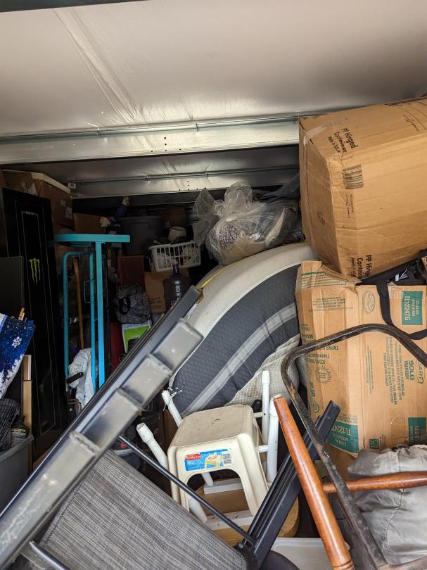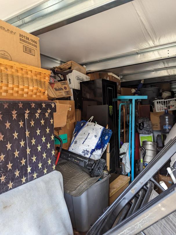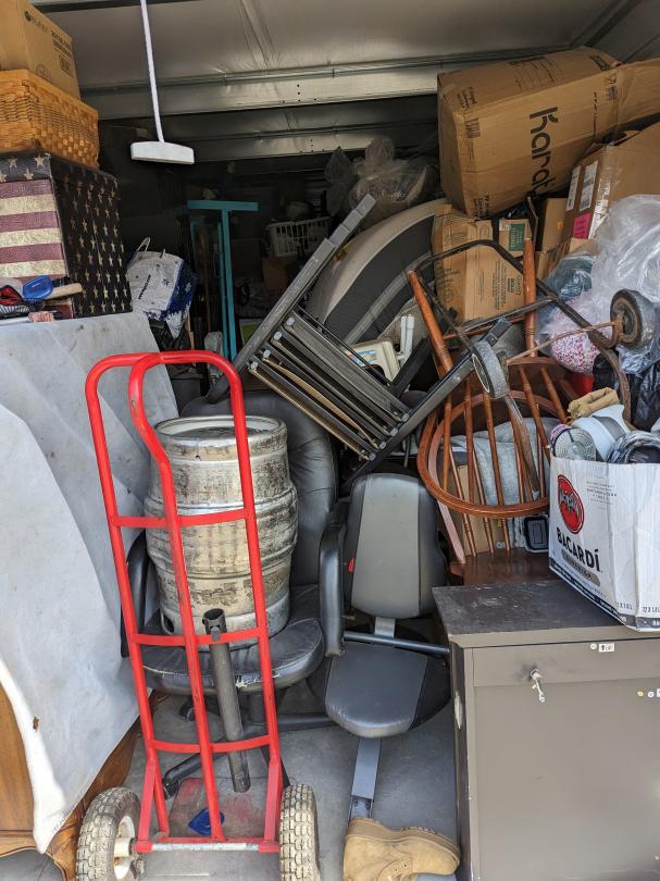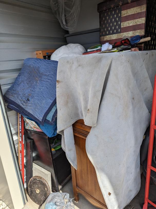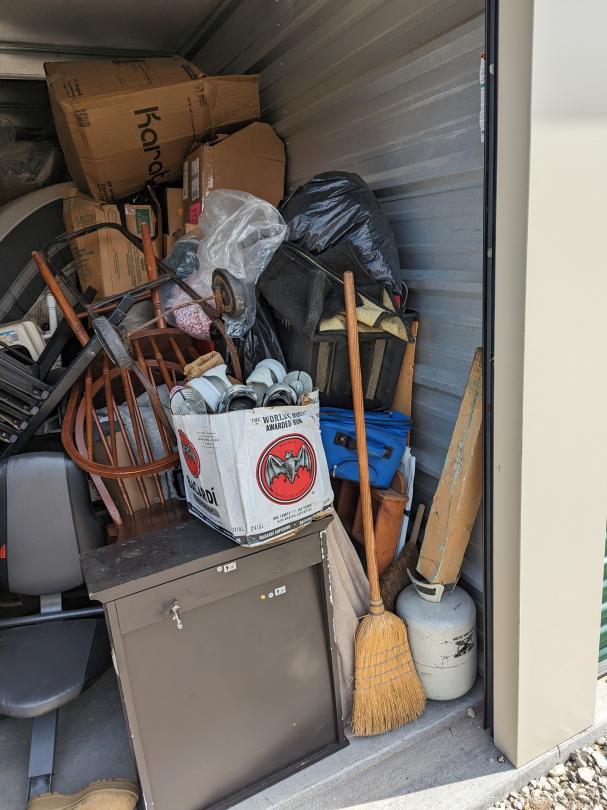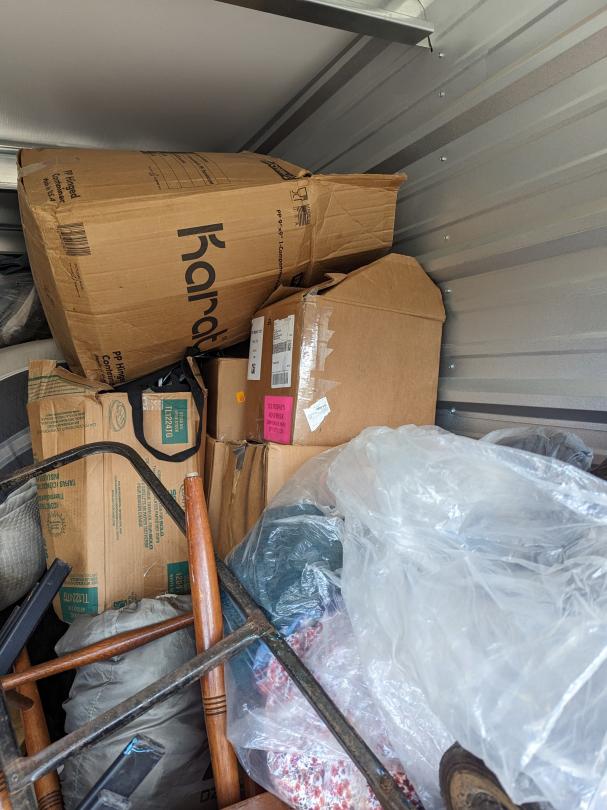 This unit appears to contain…Chair, Boxes, Beds, Clothes, Stands, Bags, Safe, Household Items