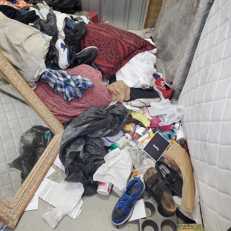 This unit appears to contain…Unit appears to contain: Mattress, clothing, plastic bags, pillows, shoes, mirror