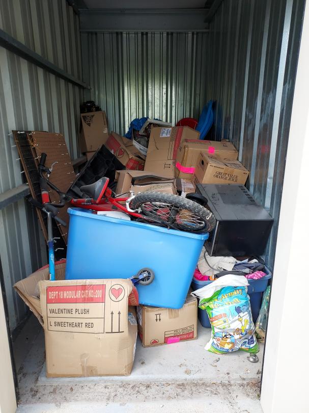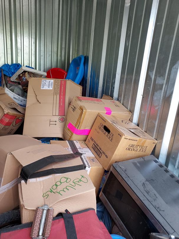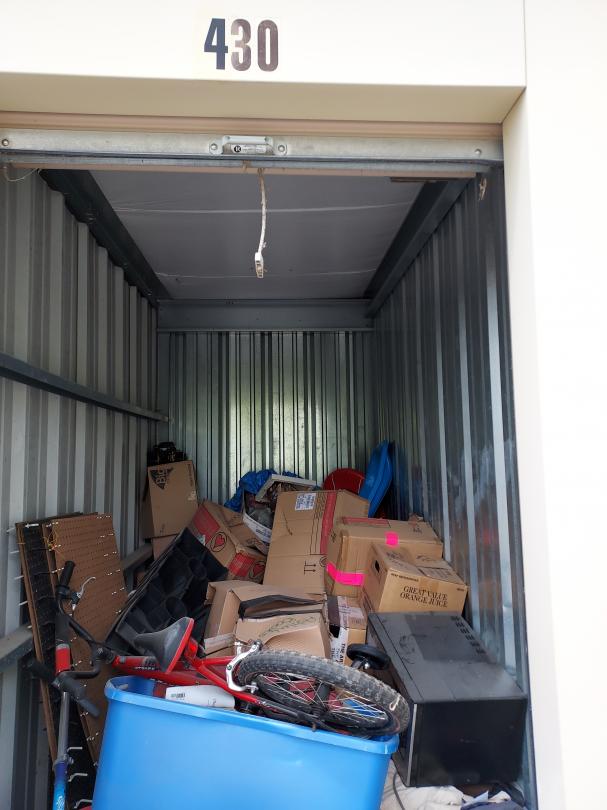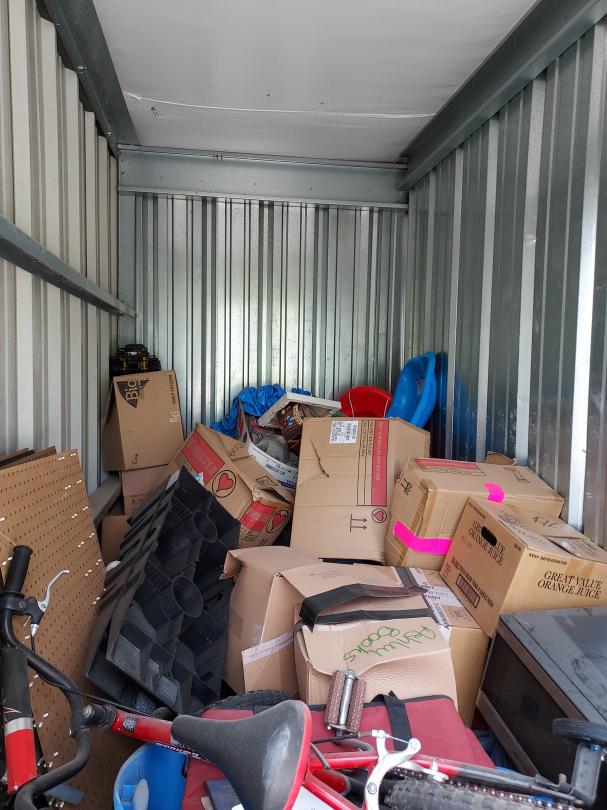 This unit appears to contain…boys bike, rc car, misc boxes, car ramps, peg board, snow sleds microwave
