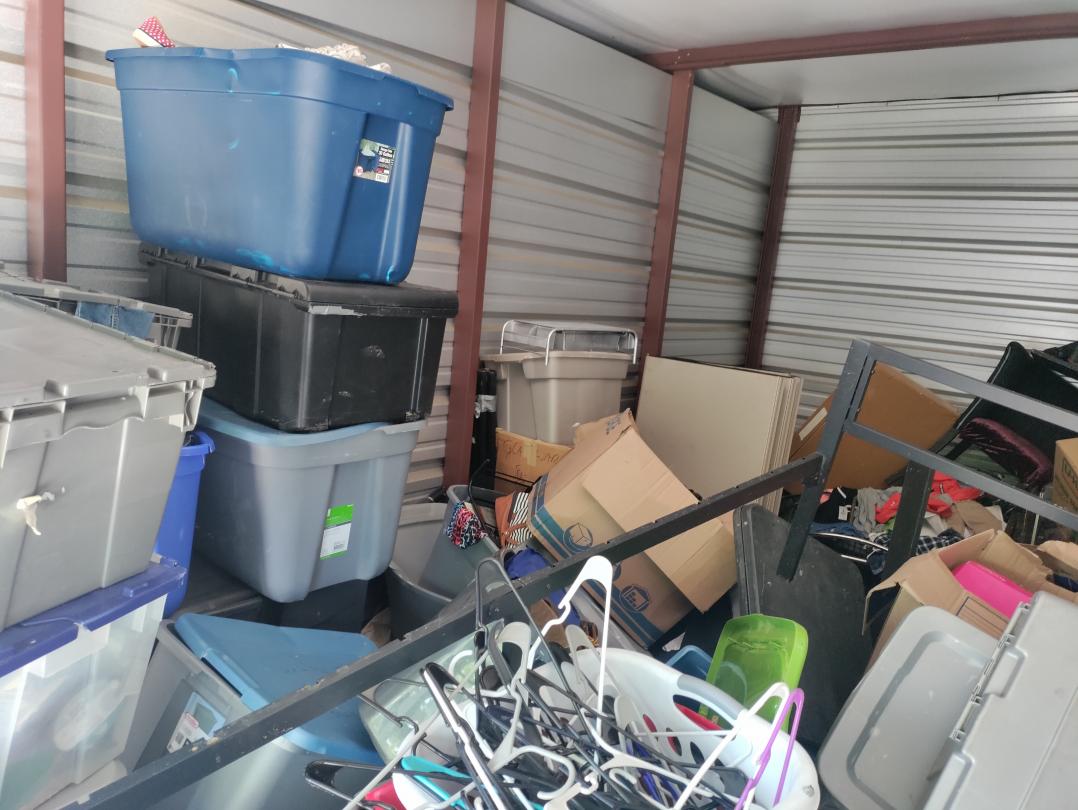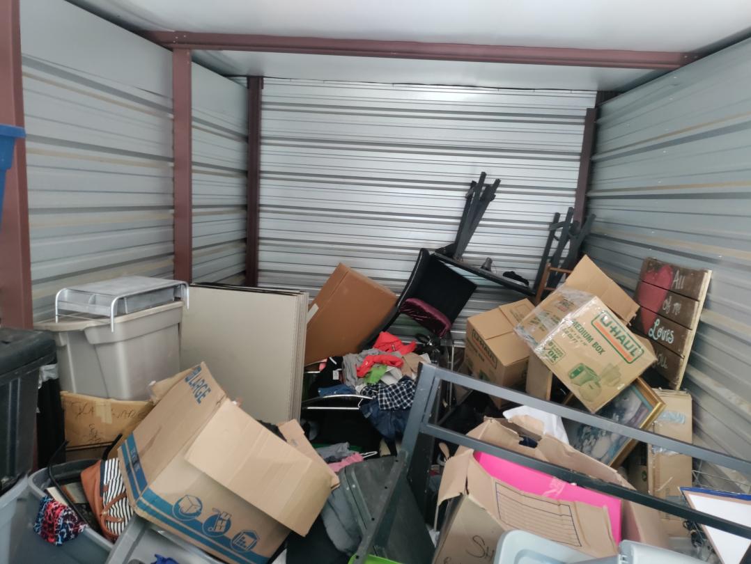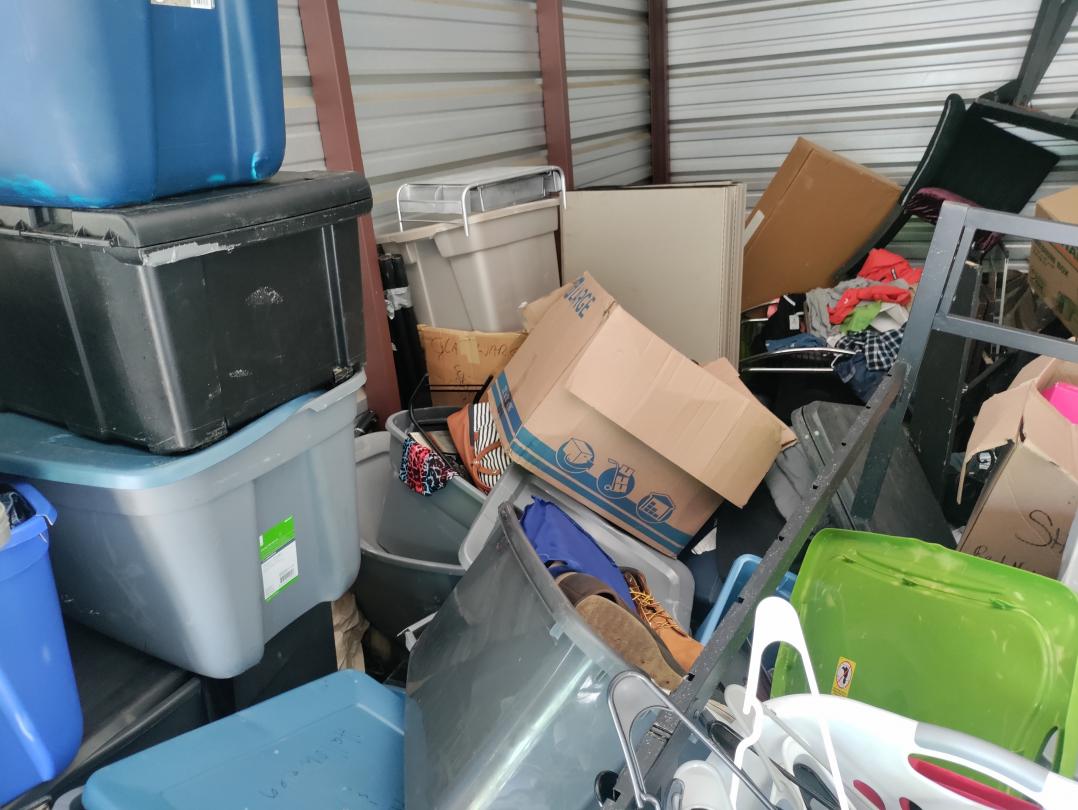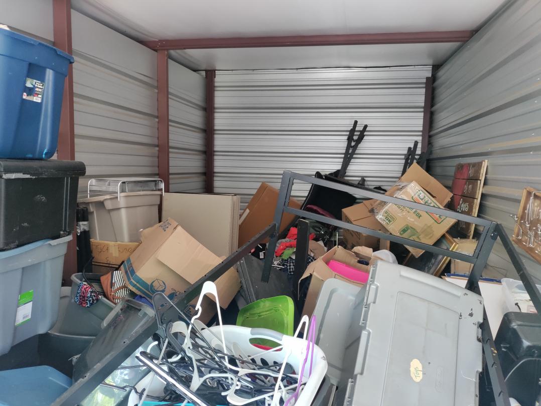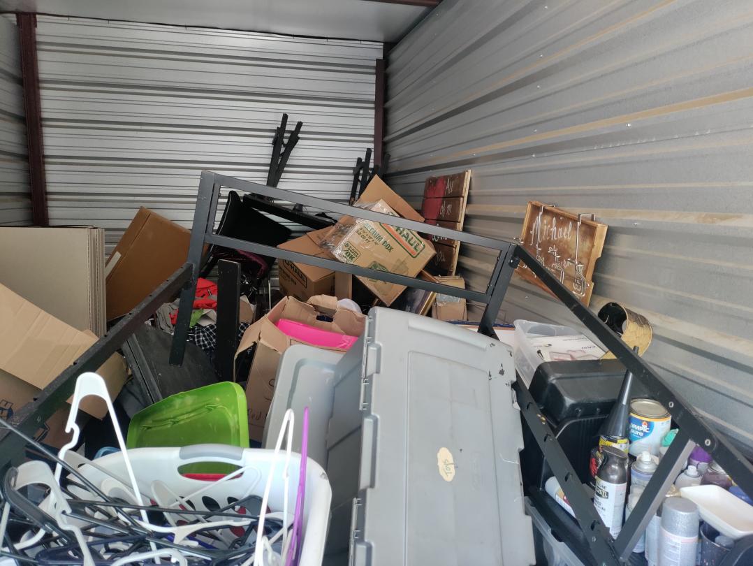 This unit appears to contain…Electronics tools home decor kitchenware clothes of all sizes and ages brand new clothes 20-30 different size totes full of misc stuff make up vanity wood material tool boxes shelving two wood chests laptops air tools mini refrigerator paint bedframes headboards and footboards and other misc