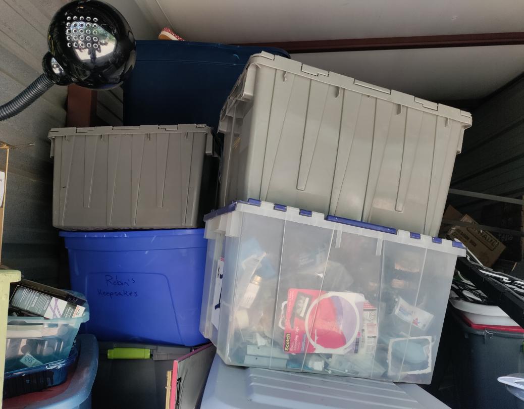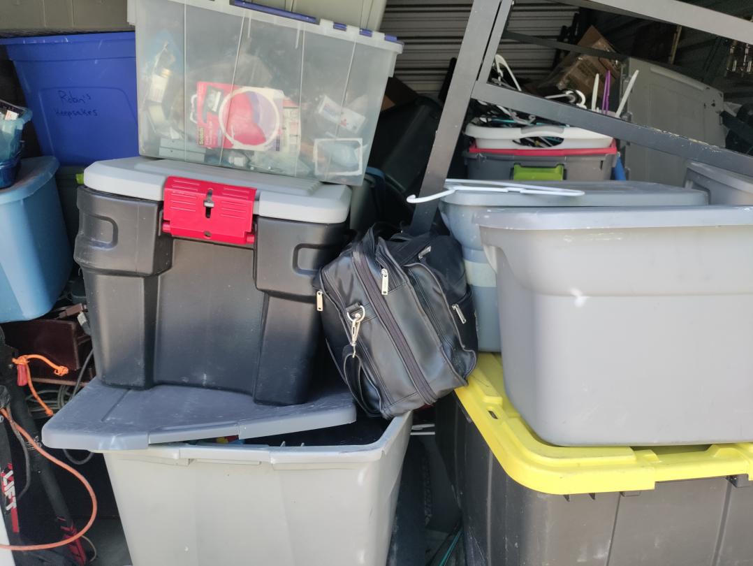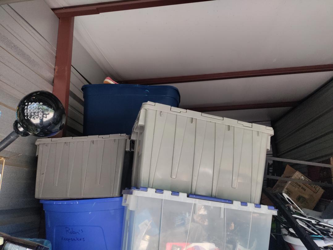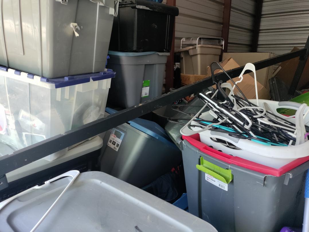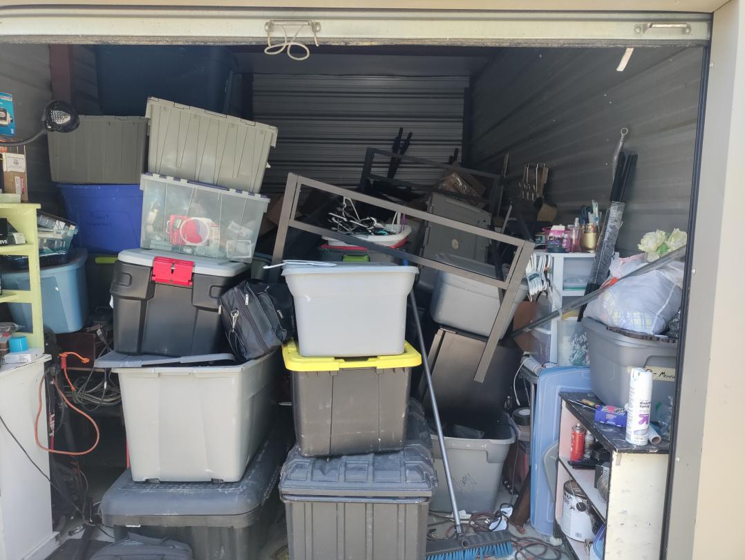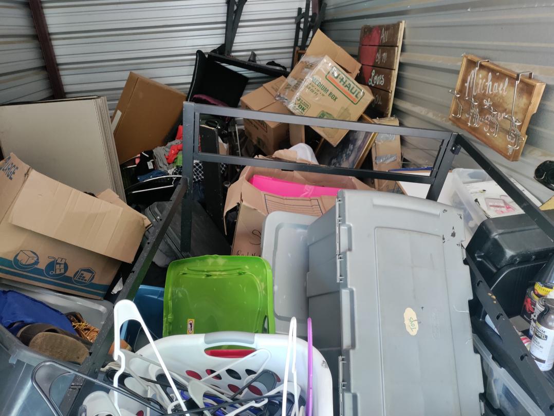 This unit appears to contain…Electronics tools home decor kitchenware clothes of all sizes and ages brand new clothes 20-30 different size totes full of misc stuff make up vanity wood material tool boxes shelving two wood chests laptops air tools mini refrigerator paint bedframes headboards and footboards and other misc
