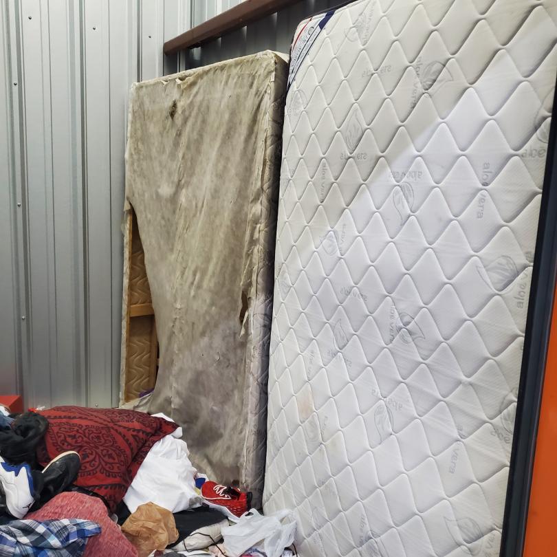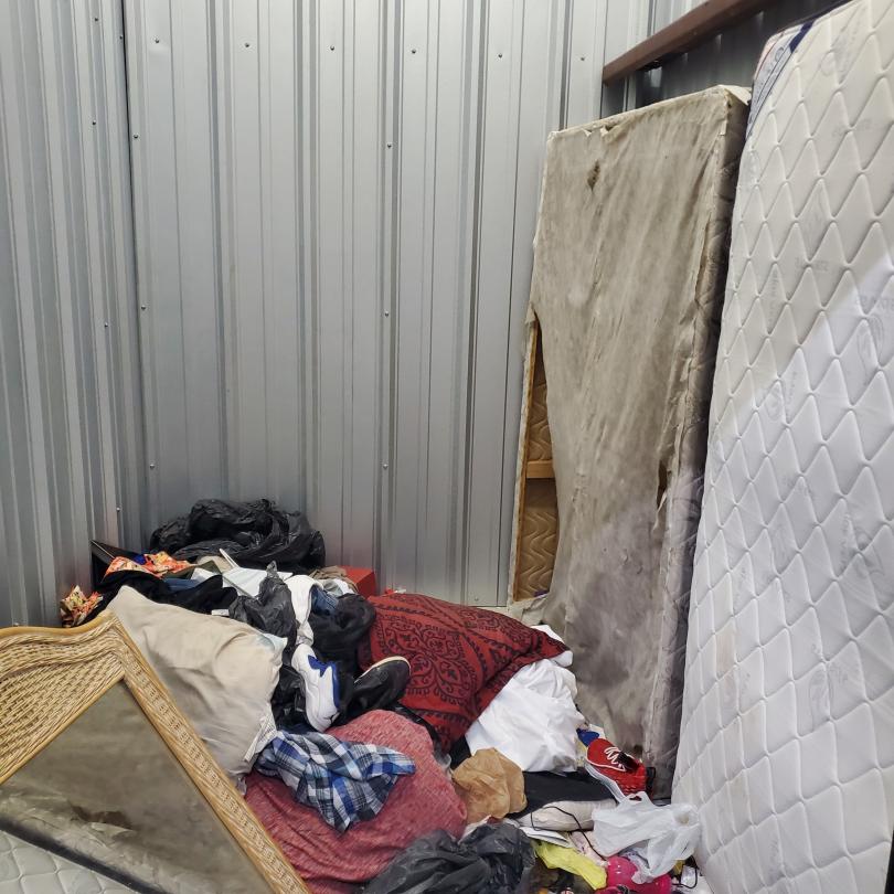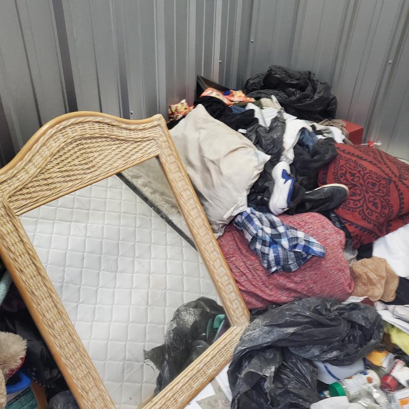 This unit appears to contain…This unit appears to contain: shoes, mirror, mattress, box spring, plastic bags, clothing