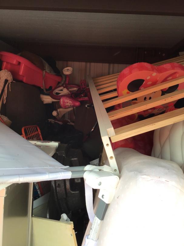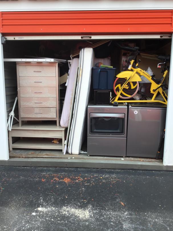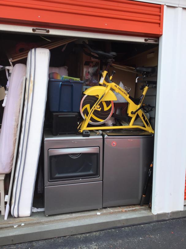 This unit appears to contain…10x10x9 Drive Up 1st Floor Outside Level No Climate, unit appears to have a washer and dryer, dresser, coffee table, exercise bike, totes, childs bike, and other miscellaneous items