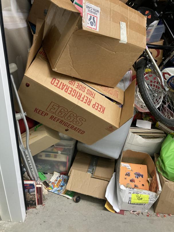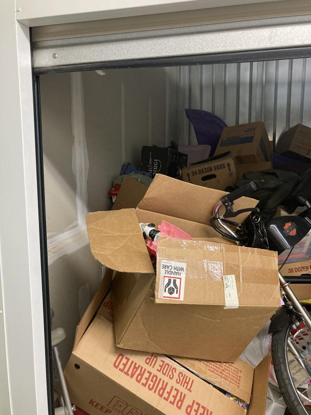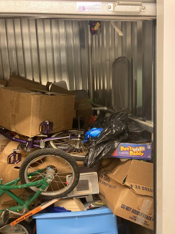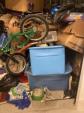 This unit appears to contain…Boxes Harley Davidson Bike Green and purple bikes Storage totes Toys / Games Various Items