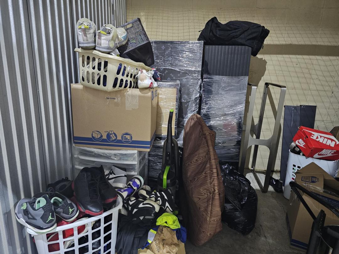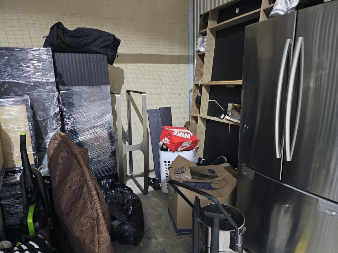 This unit appears to contain…Fridge, Plastic Bags, Misc. Boxes, Misc. Items, Laundry Baskets, shoes, vacuum, clothes