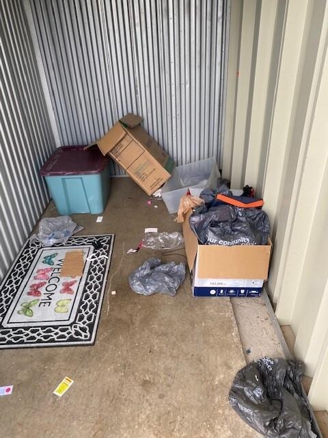 This unit appears to contain…Boxes, Bags, Plastic bins, Welcome Mat
