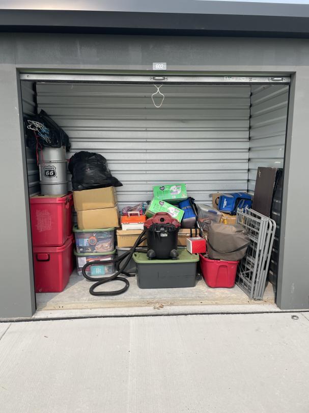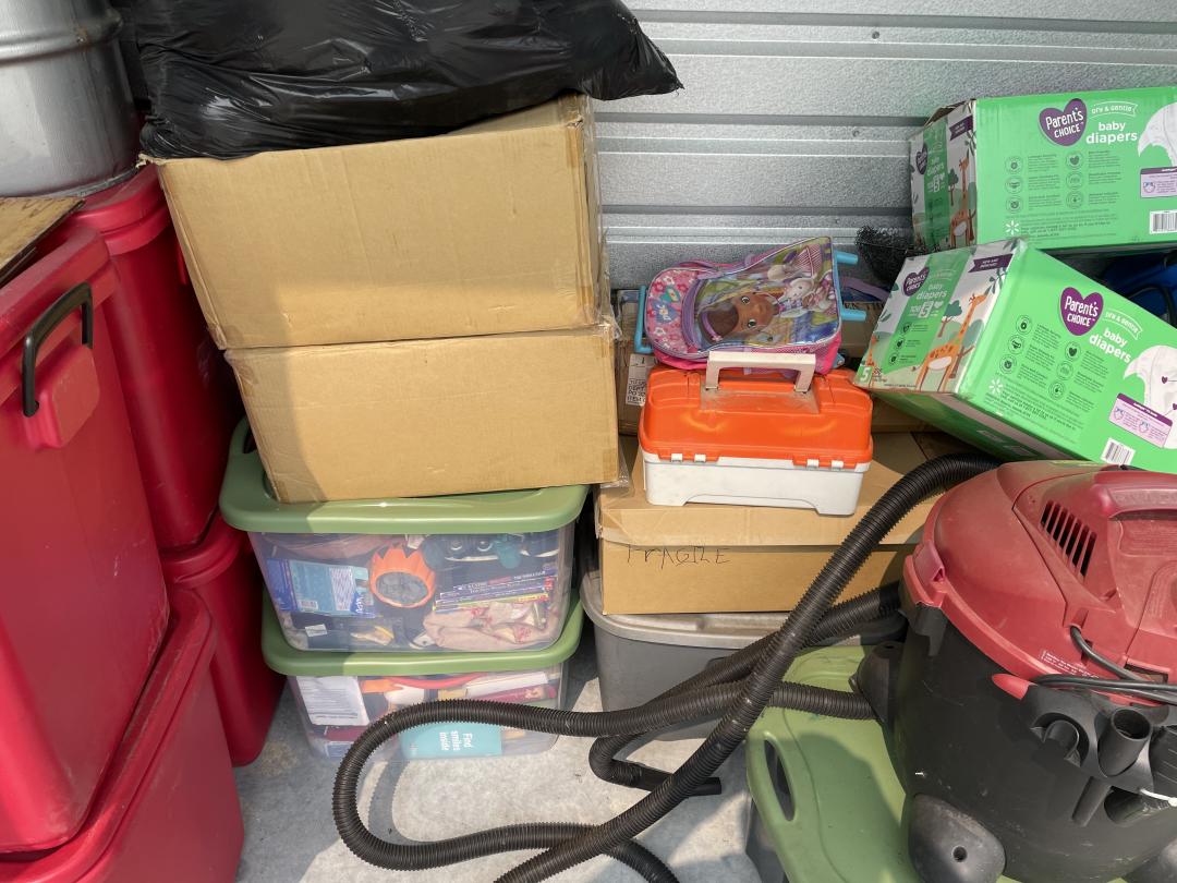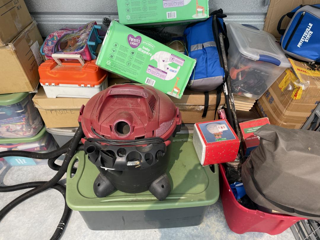 This unit appears to contain…Unit appears to contain; Totes, plastic barrel, boxes, shop-vac, tackle box, cookware,
