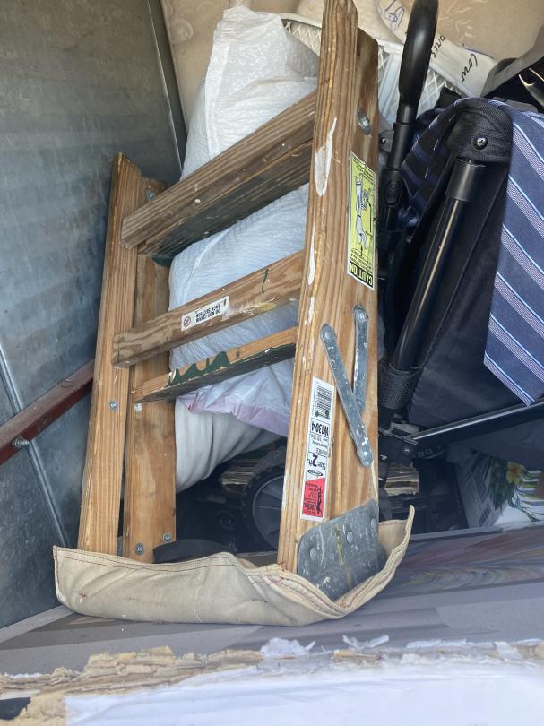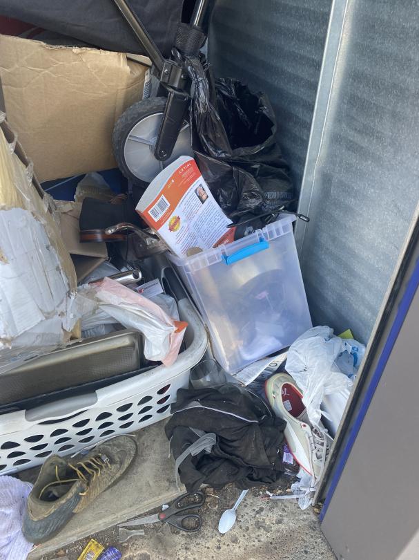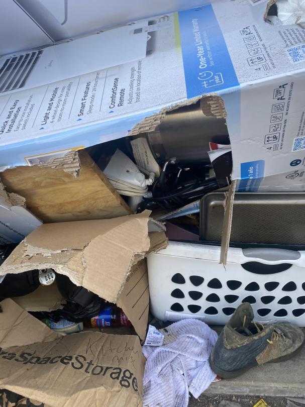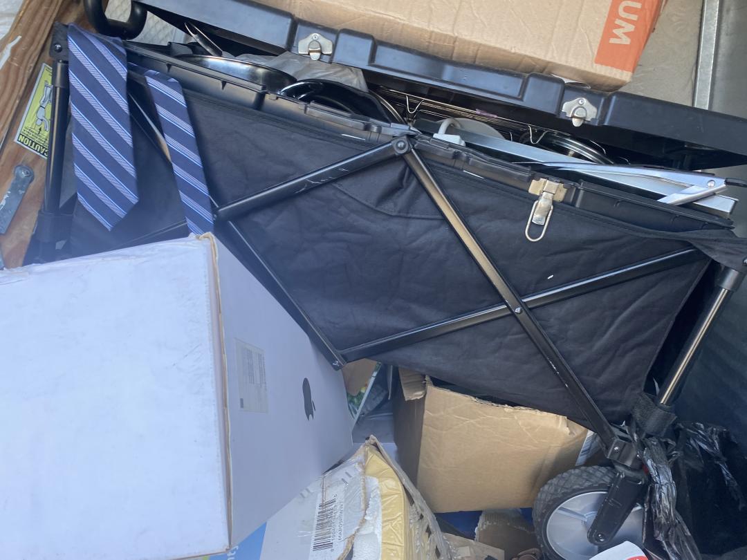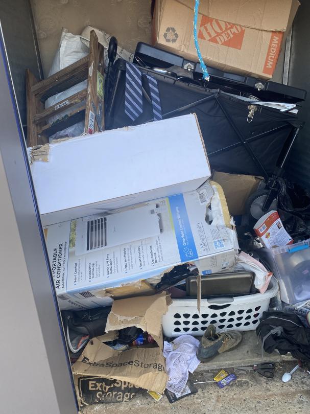 This unit appears to contain…Wagon, Boxes, Ladder, Clothes,, Shoes, Mattress, Bags, Pots and Pans