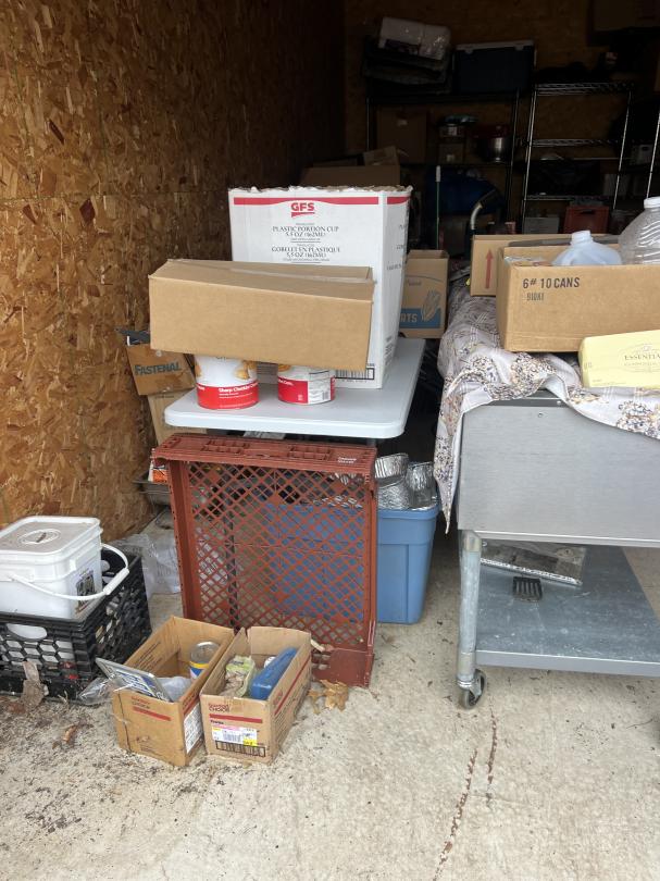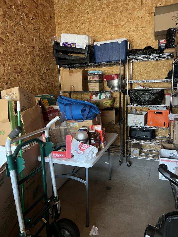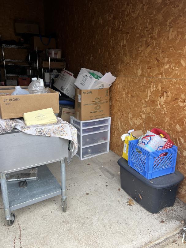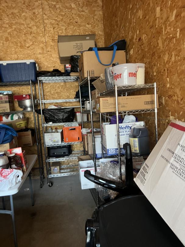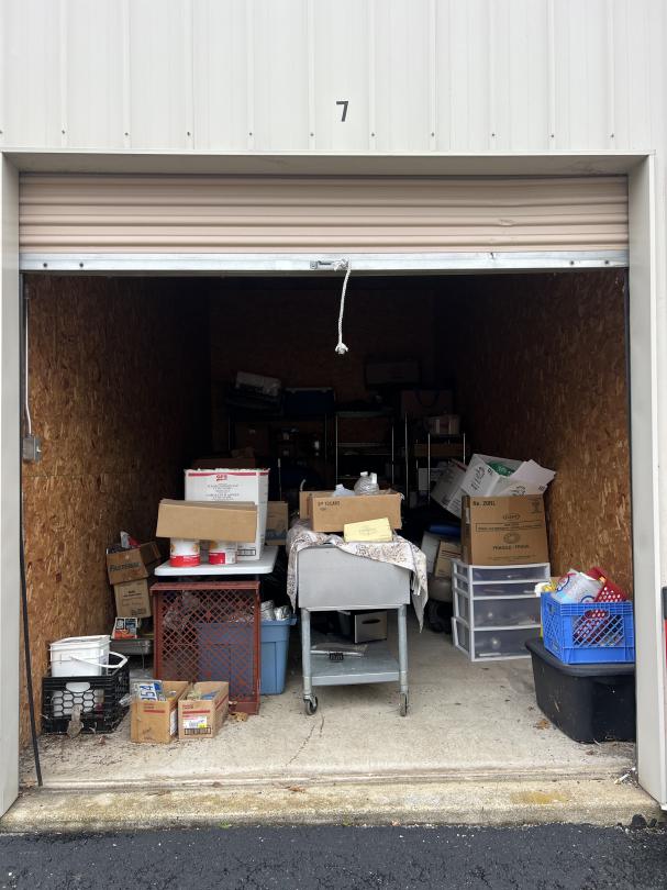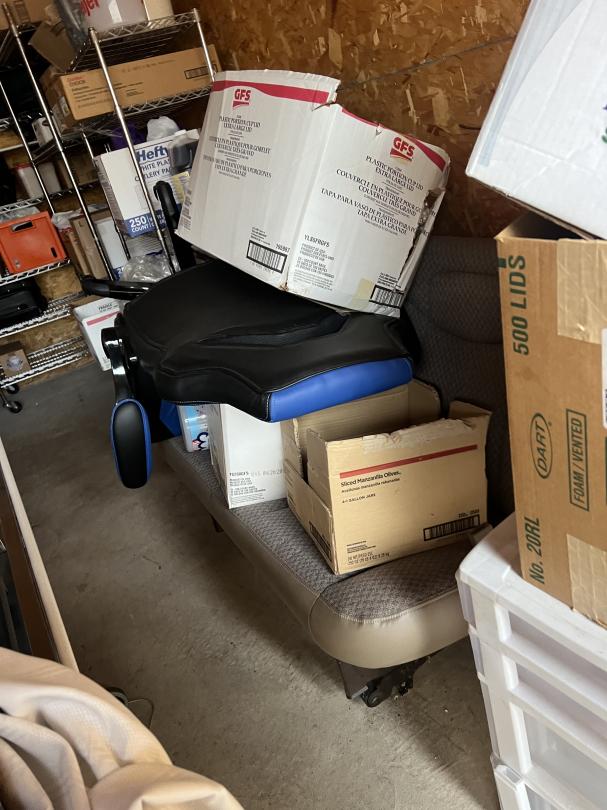 This unit appears to contain…Restaurant equipment, boxes, shelving, bench car seat, gaming chair
