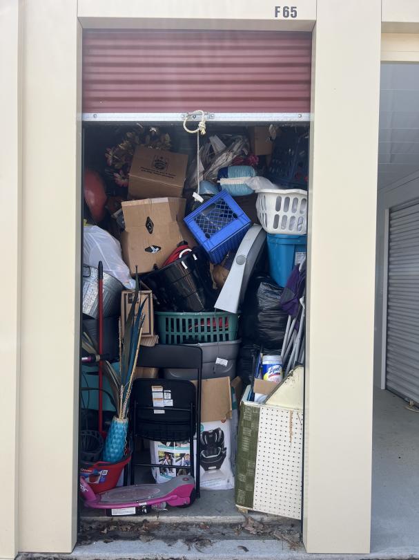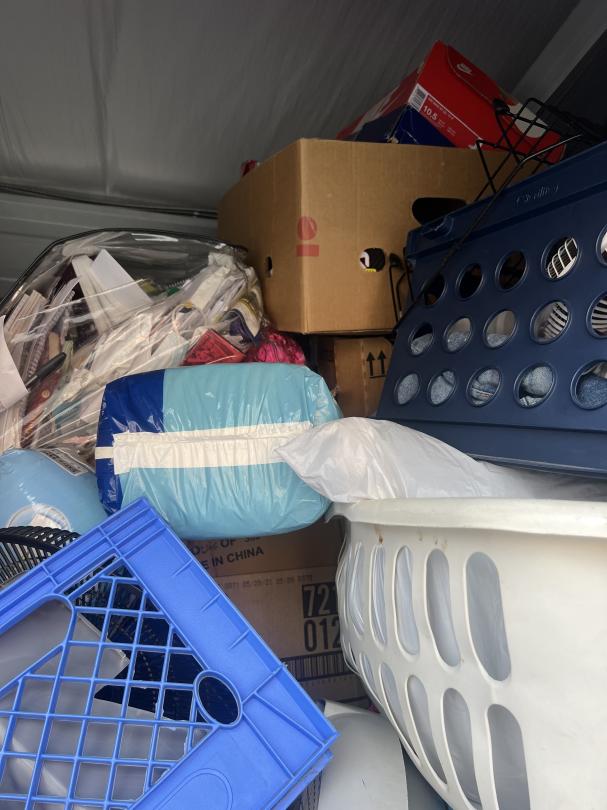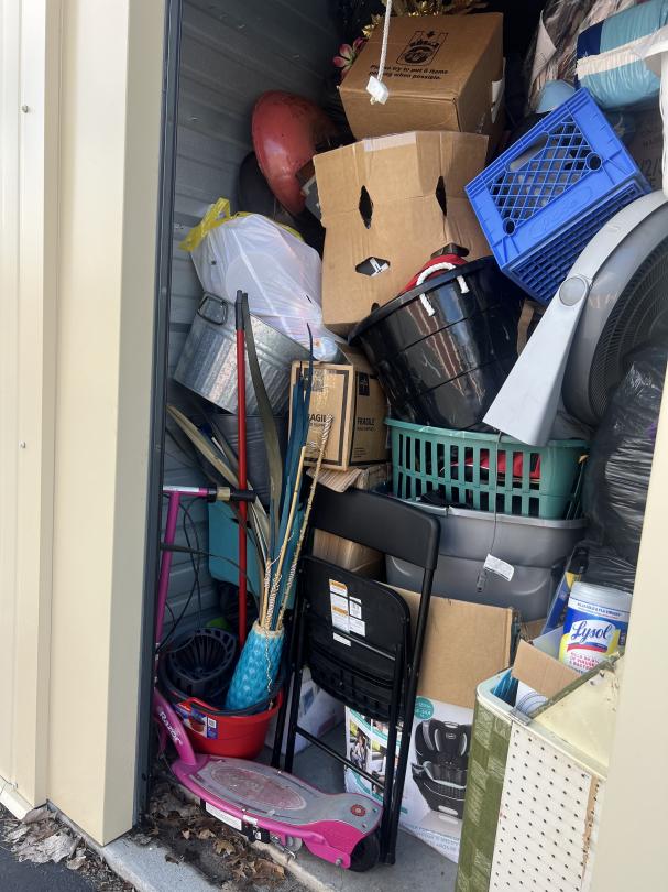 This unit appears to contain…Scooter, boxes, laundry baskets, various items