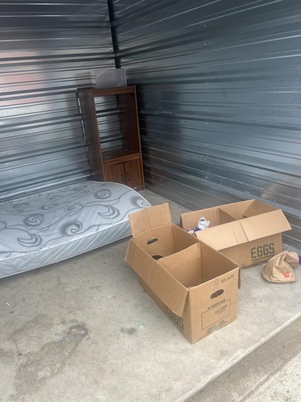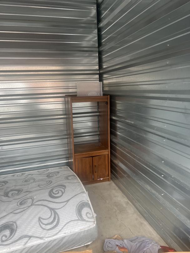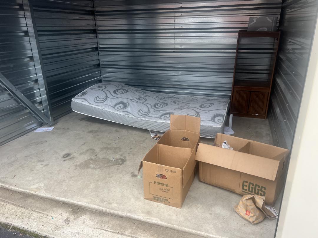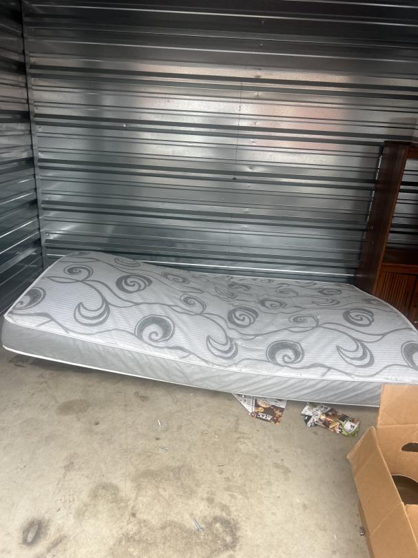 This unit appears to contain…Mattress, wooden shelving, boxes