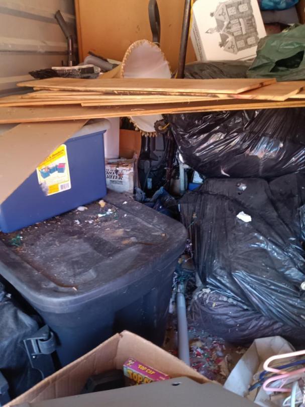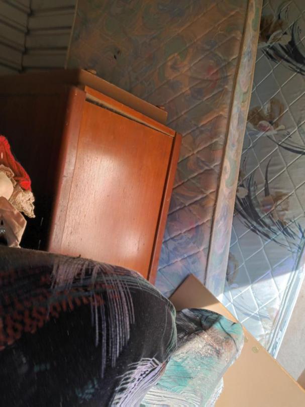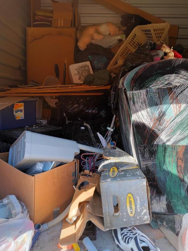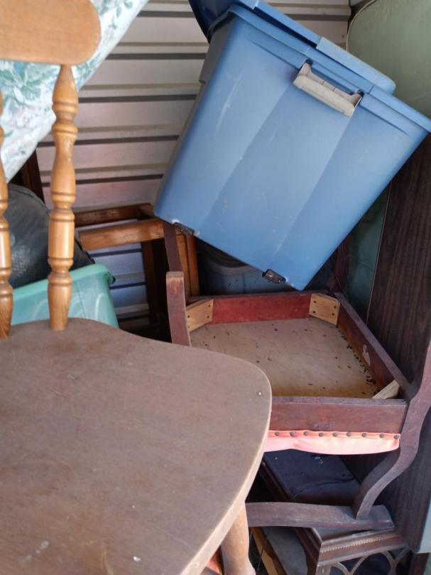 This unit appears to contain…Miscellaneous household items: table, chairs, mattresses, sofa