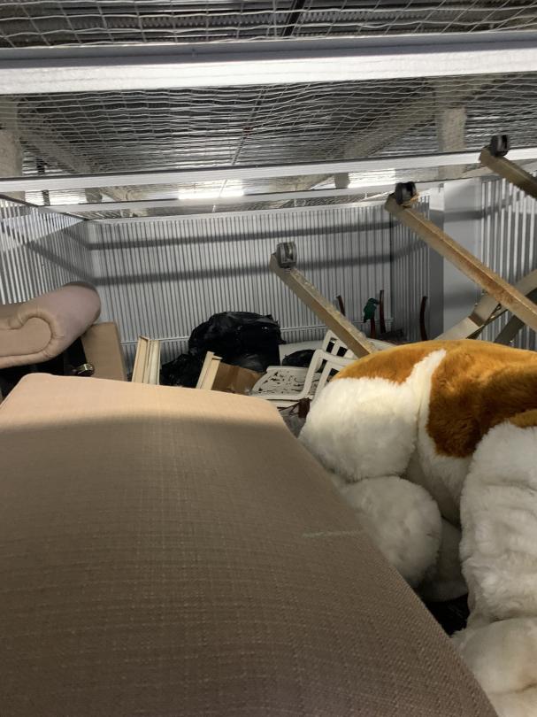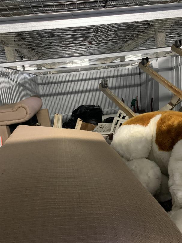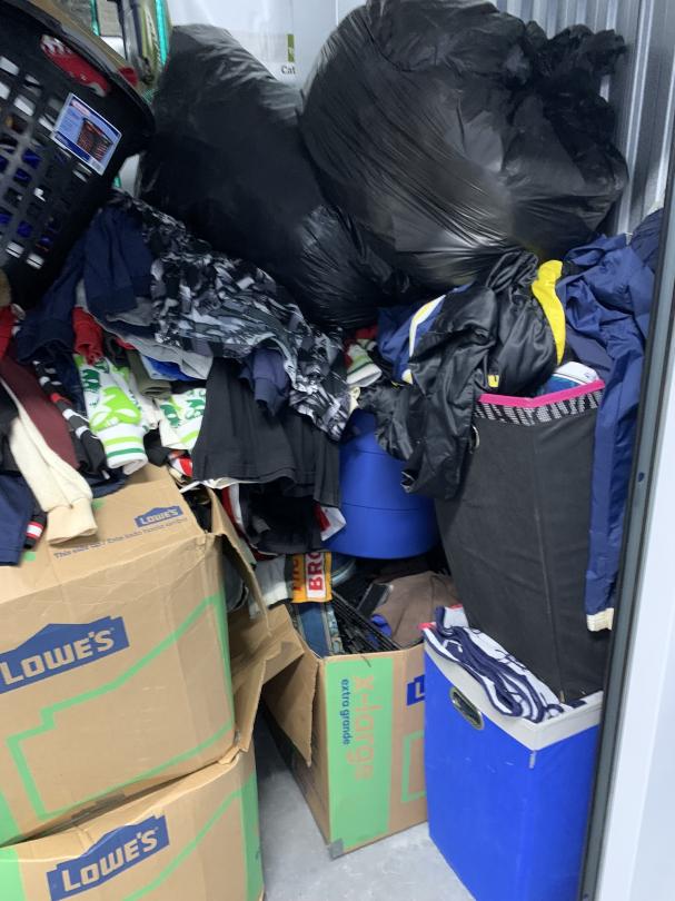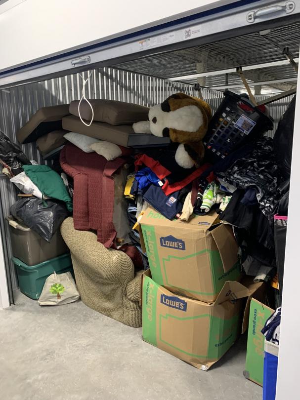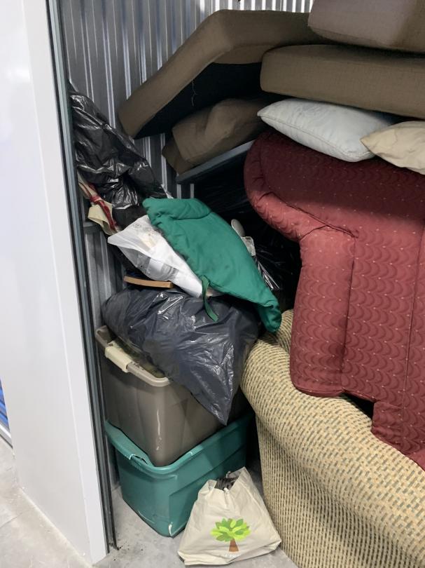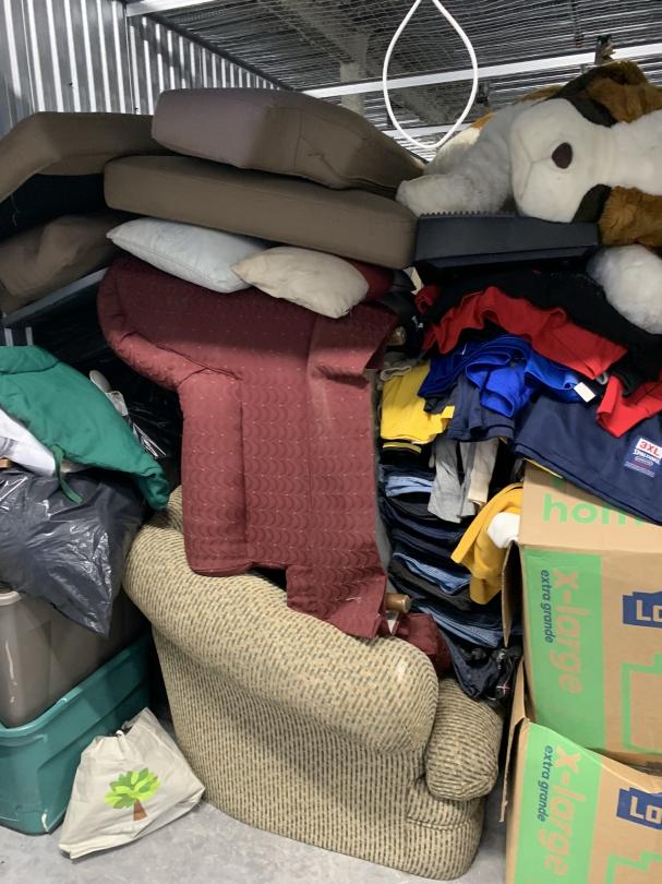 This unit appears to contain…Couch, chairs, clothes, totes, boxes
