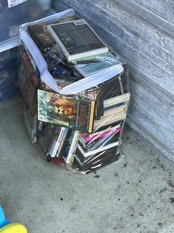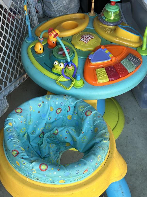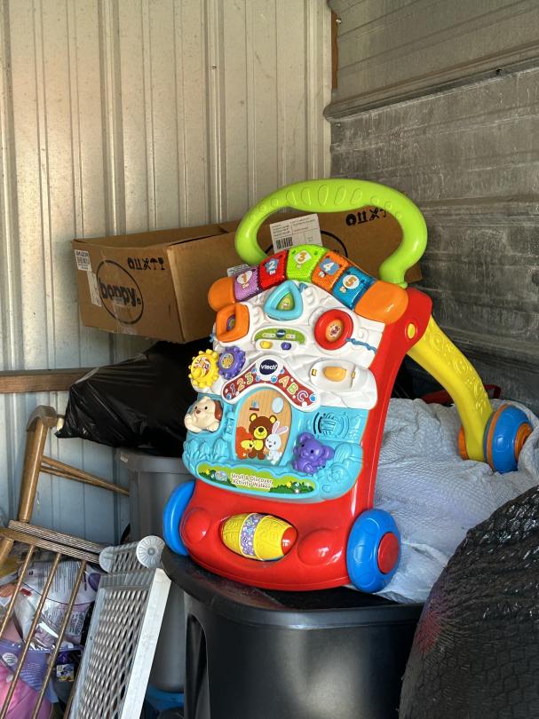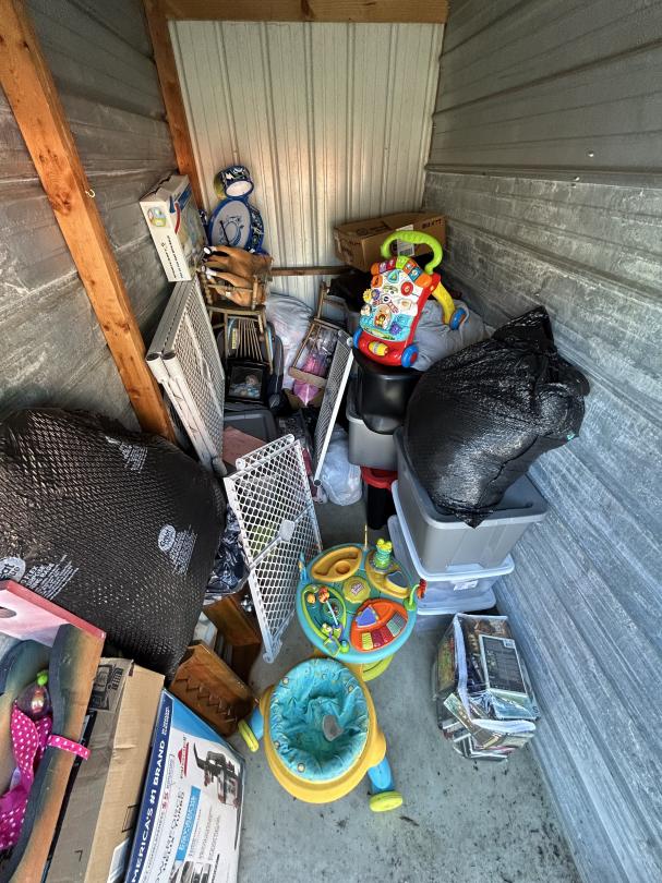 This unit appears to contain…Toys, Shelving, DVDs, Kids Rocking Chairs, Porcelain doll, Baby Gate, Car seat, Totes