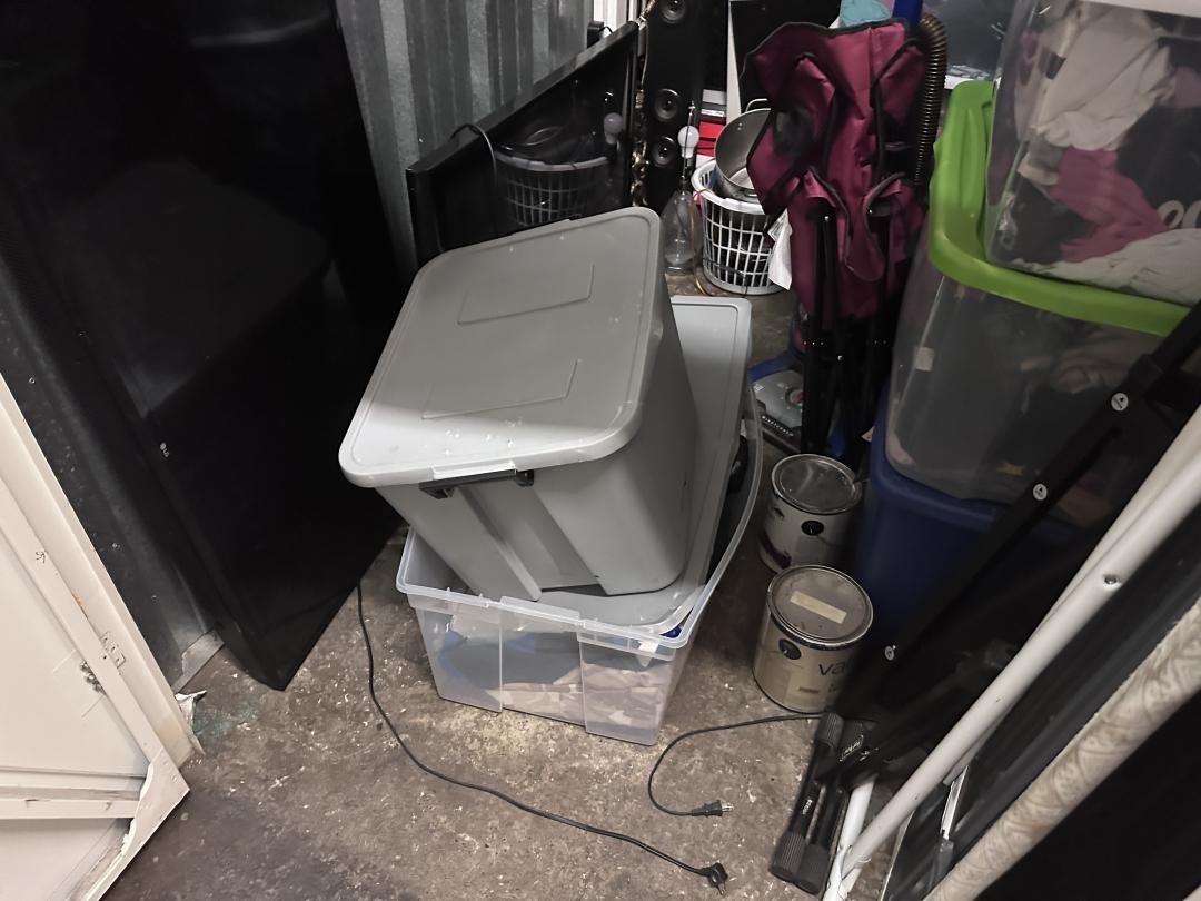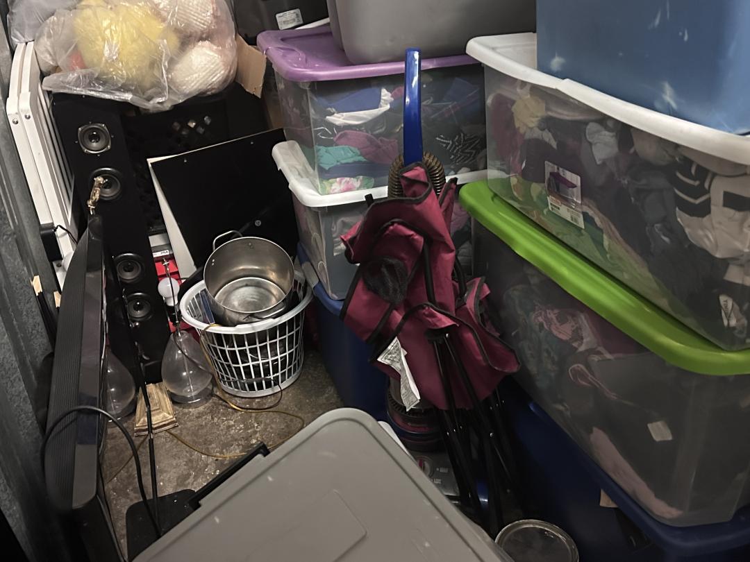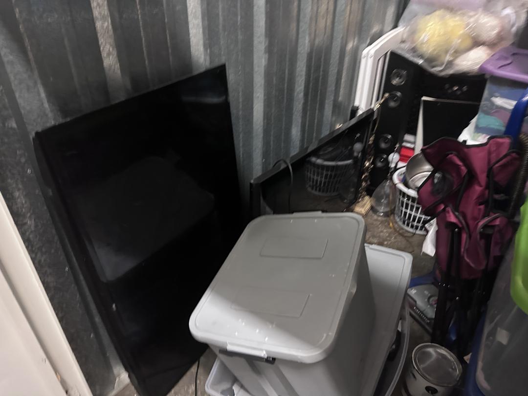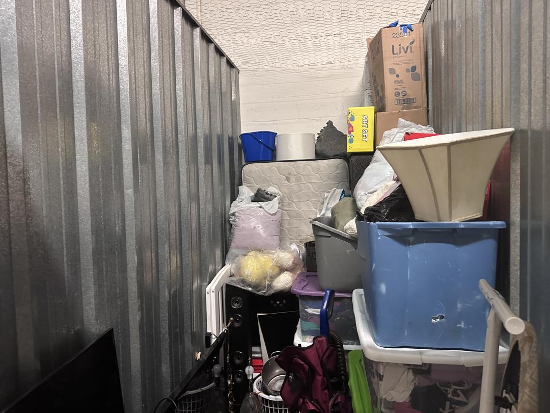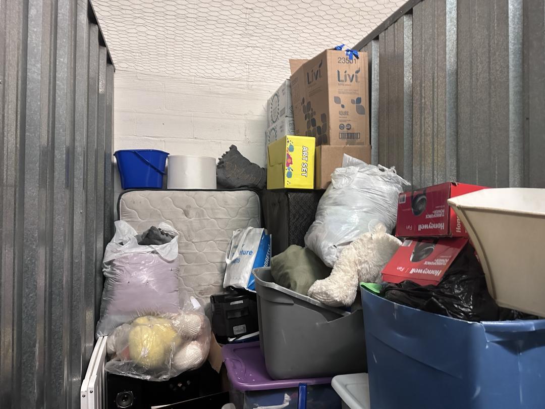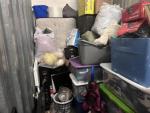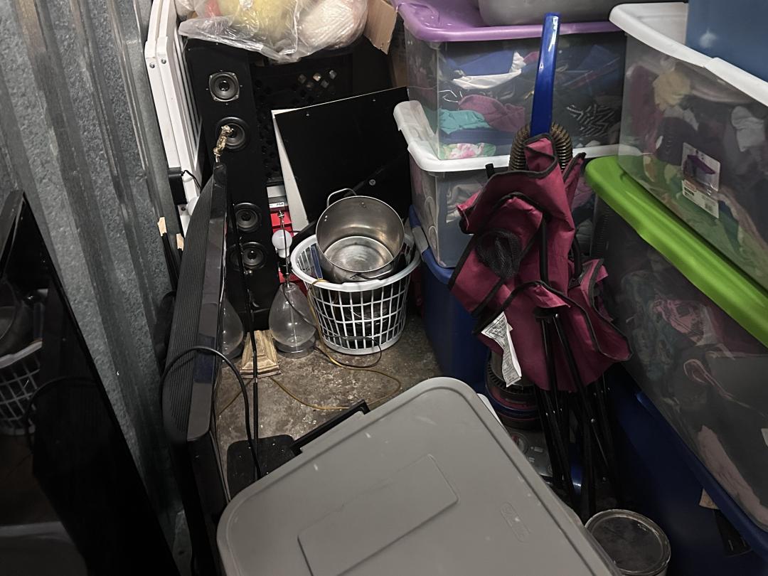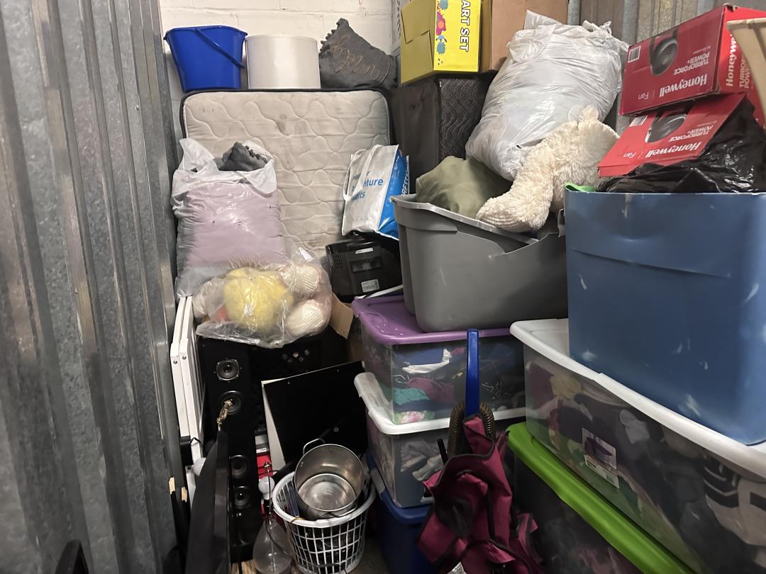 This unit appears to contain…TV,Mattresses,Box Springs,Bed Frame,Lamps,Chairs,Kitchenware,Ironing Board,Plastic Bags,Misc. Boxes,Clothing,Misc. Items,Laundry Baskets,Cleaning Supplies