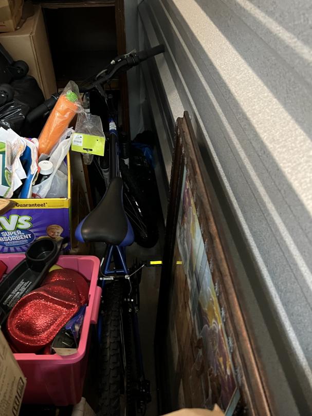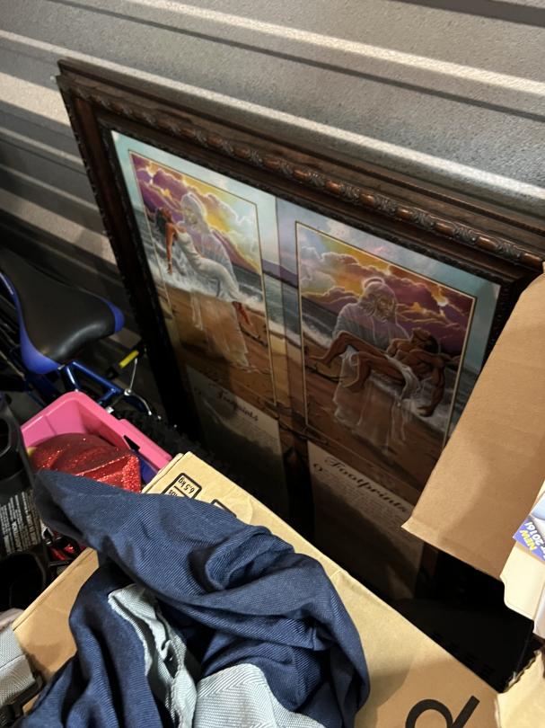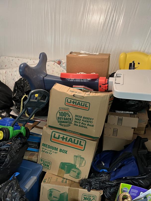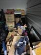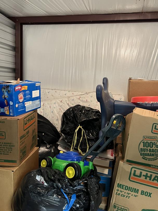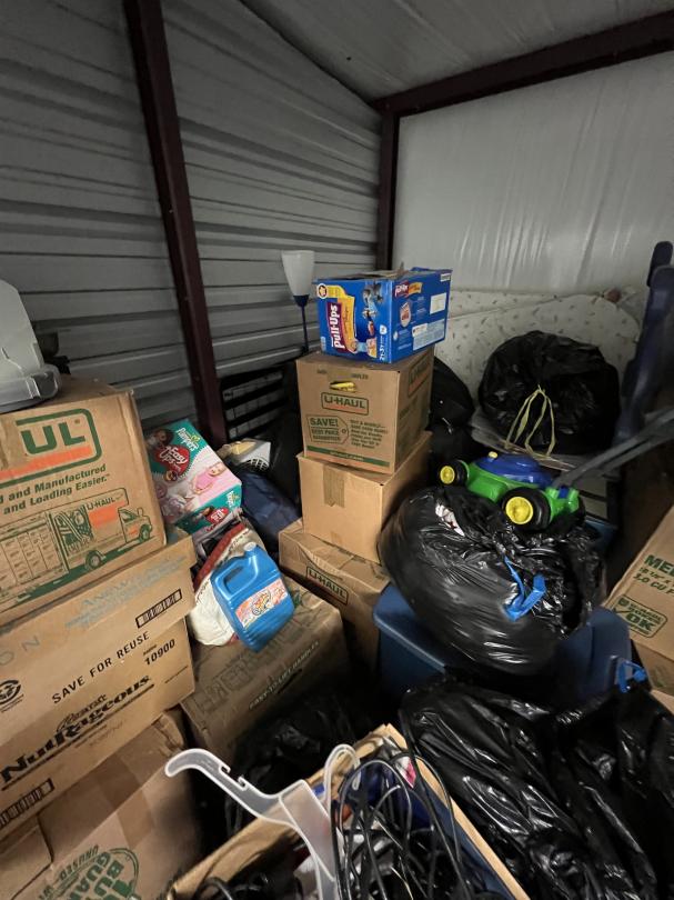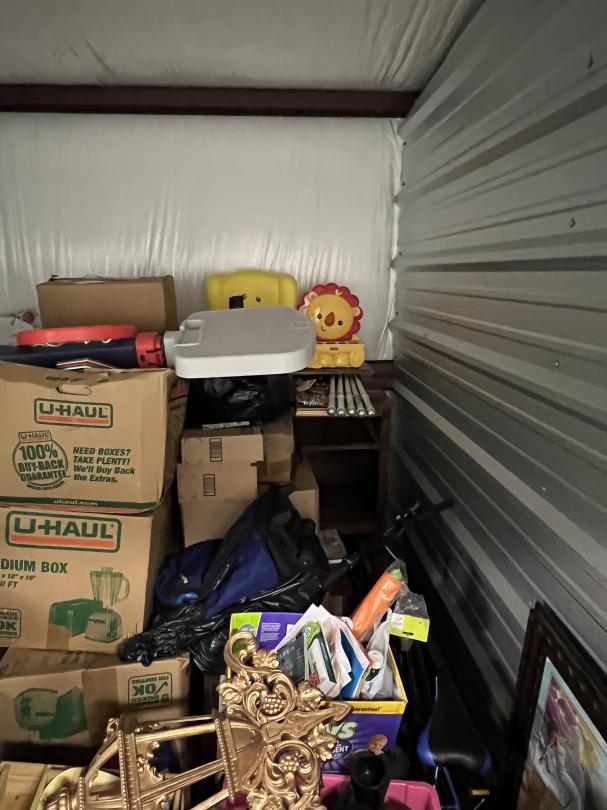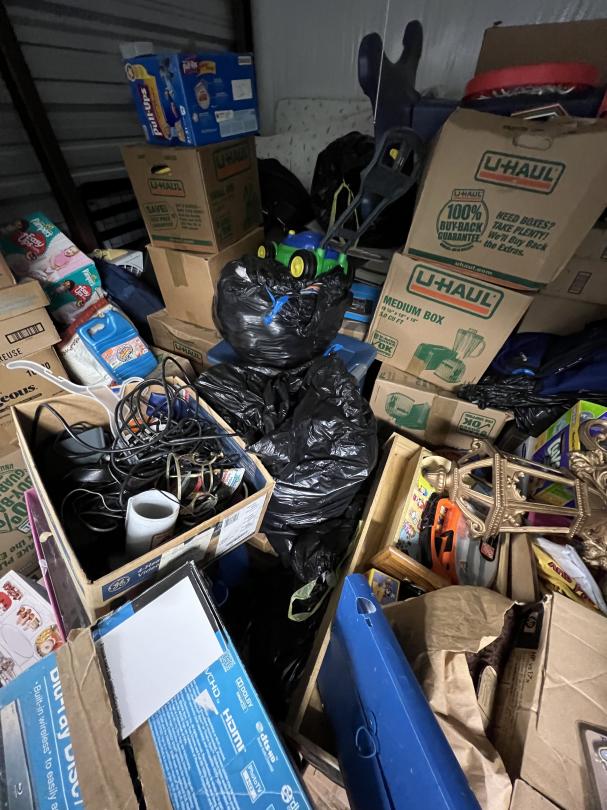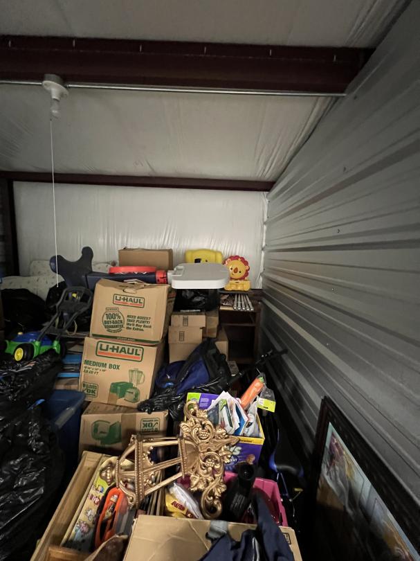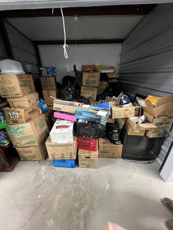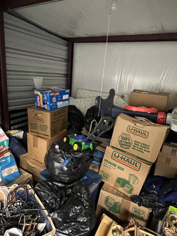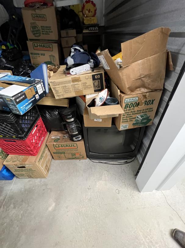 This unit appears to contain…Boxes, box tv, kids toys, shelf, coffee pot, kids mattress, lamp, Totes, miss stuff