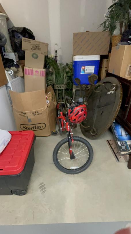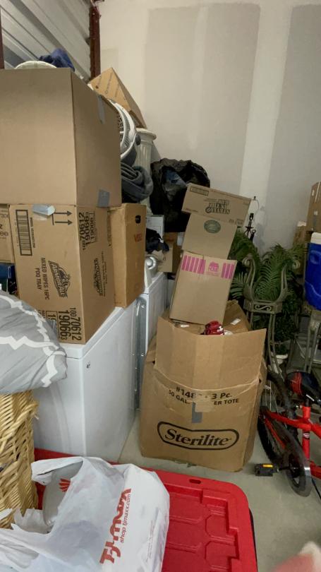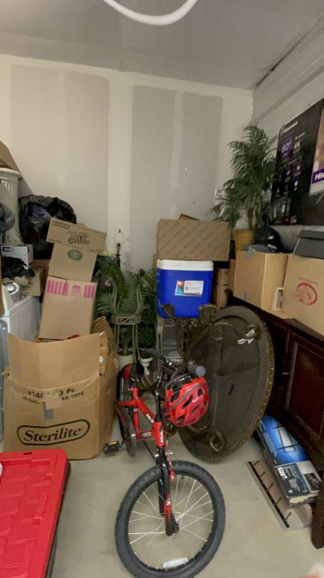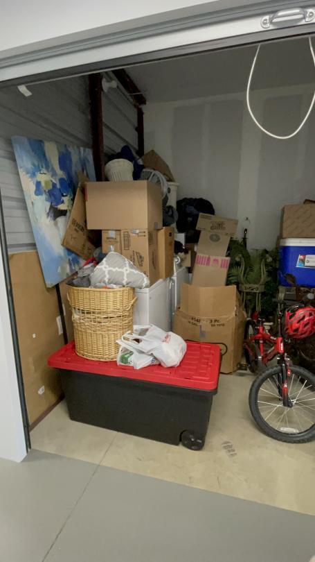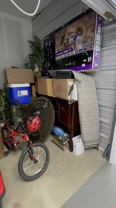 This unit appears to contain…bike, boxes, rug, washer, dryer, lamps, end tables, wall art, cooler