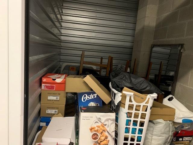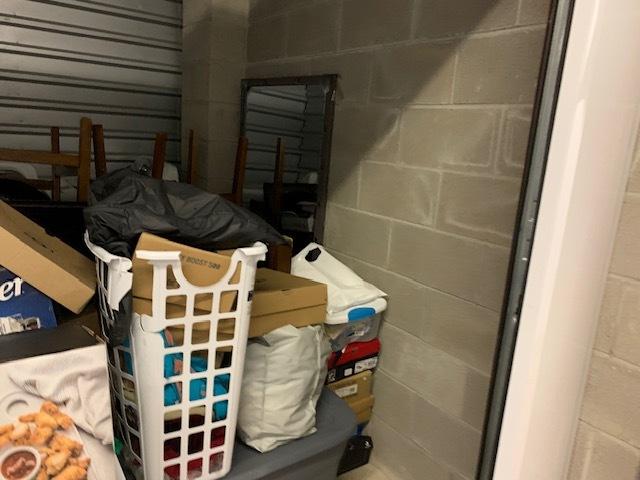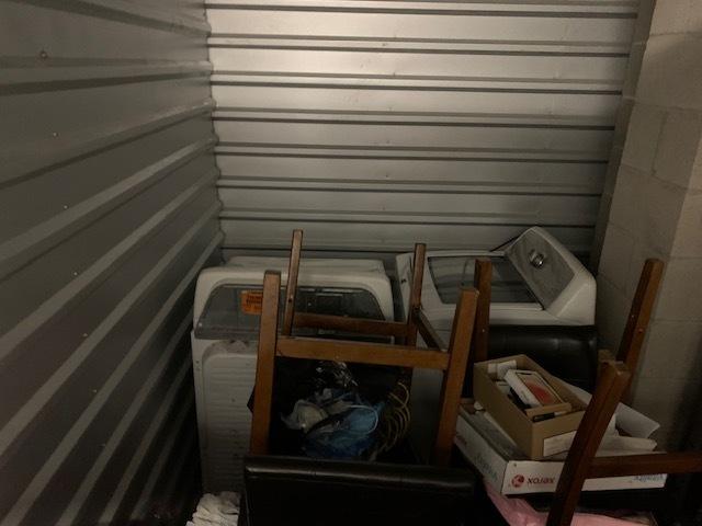 This unit appears to contain…Climate Controlled First Floor mirror, washer / dryer, boxes, 4 bar chairs. table. totes, laundry baskets. misc