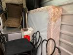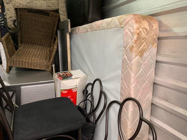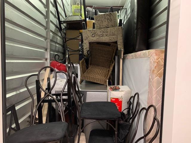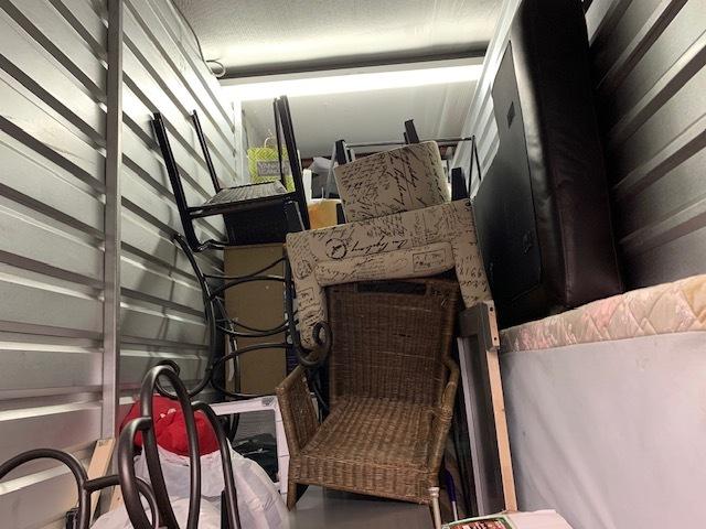 This unit appears to contain…Climate Controlled Upper Floor bed headboard / footboard. dining room table with 4 chairs. sofa, bar stool. patio furniture, dresser, Chester drawers, chair with ottoman, wall art, Christmas tree, bags, purse