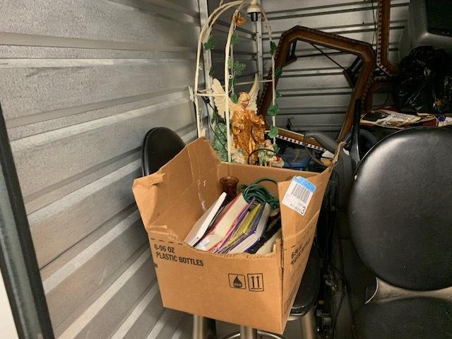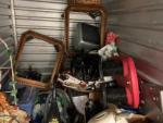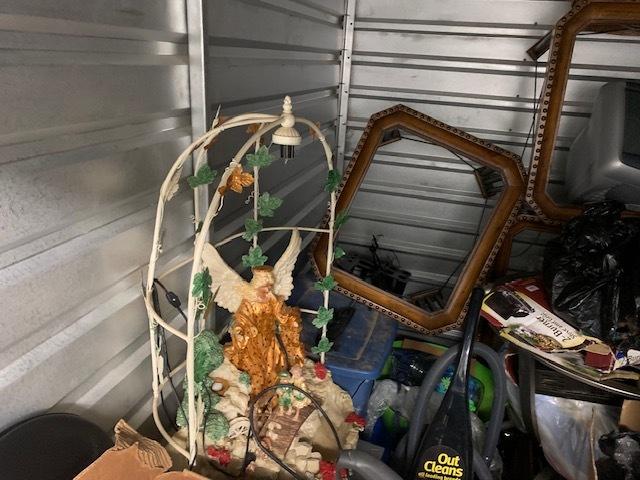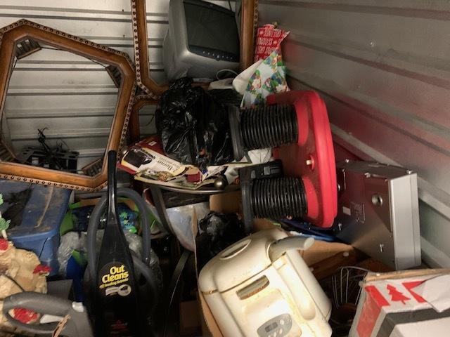 This unit appears to contain…climate control Barstool. Christmas tree, deep fryer, Bissel floor cleaner, boxes, exercise steps, Mother Mary Fountain , computer monitor, basket, coffee table, end table ,totes misc