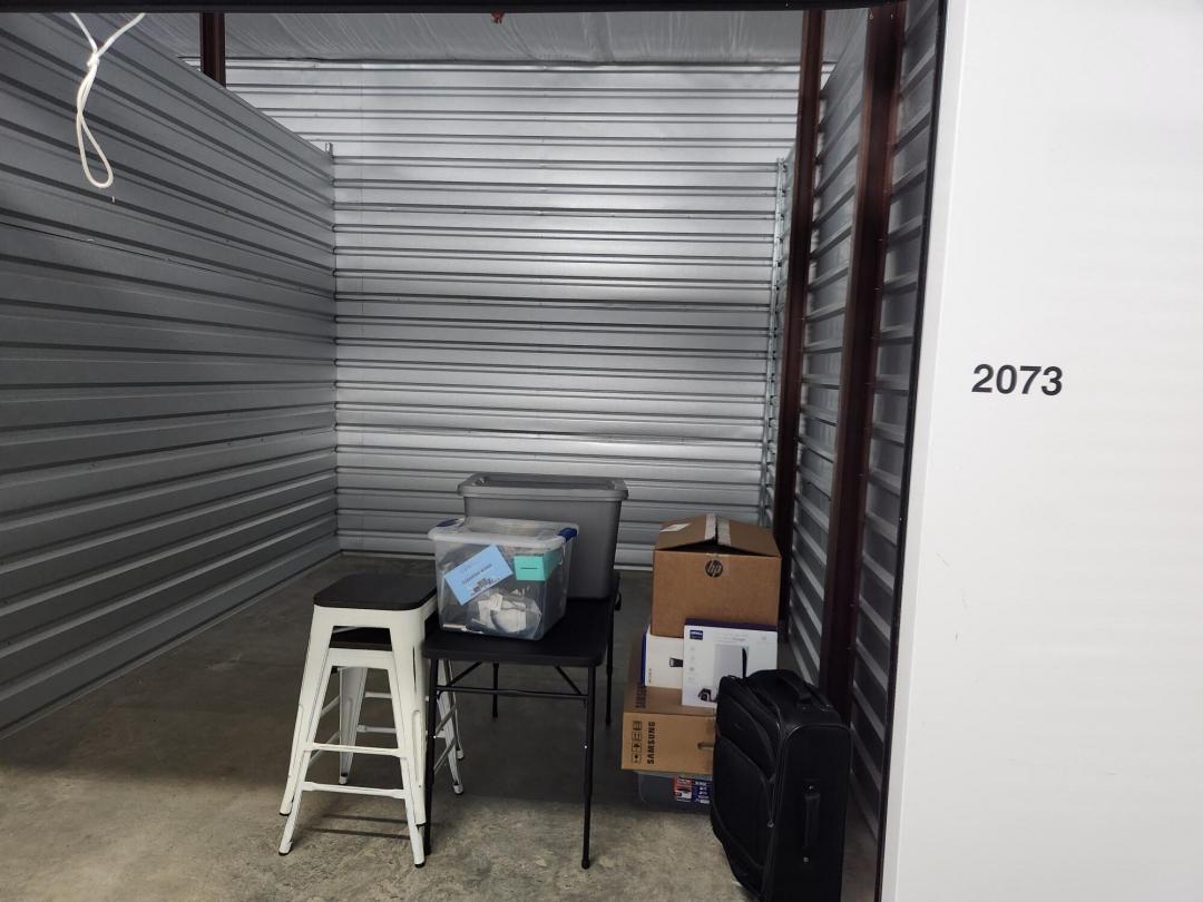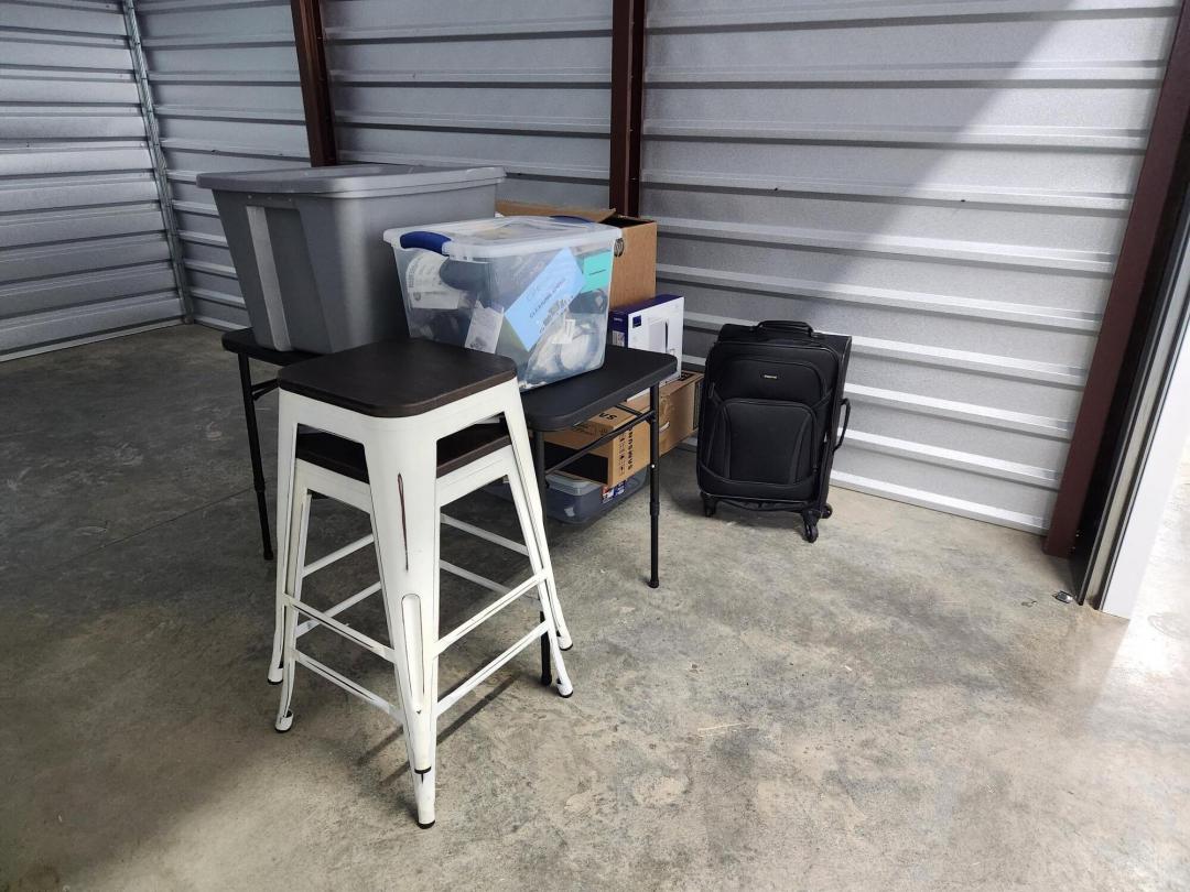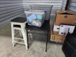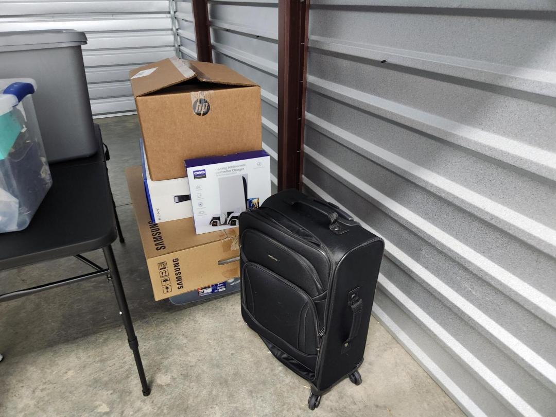 This unit appears to contain…Unit appears to contain, video games, suitcase, Samsung box, folding table, bins, metal stools.